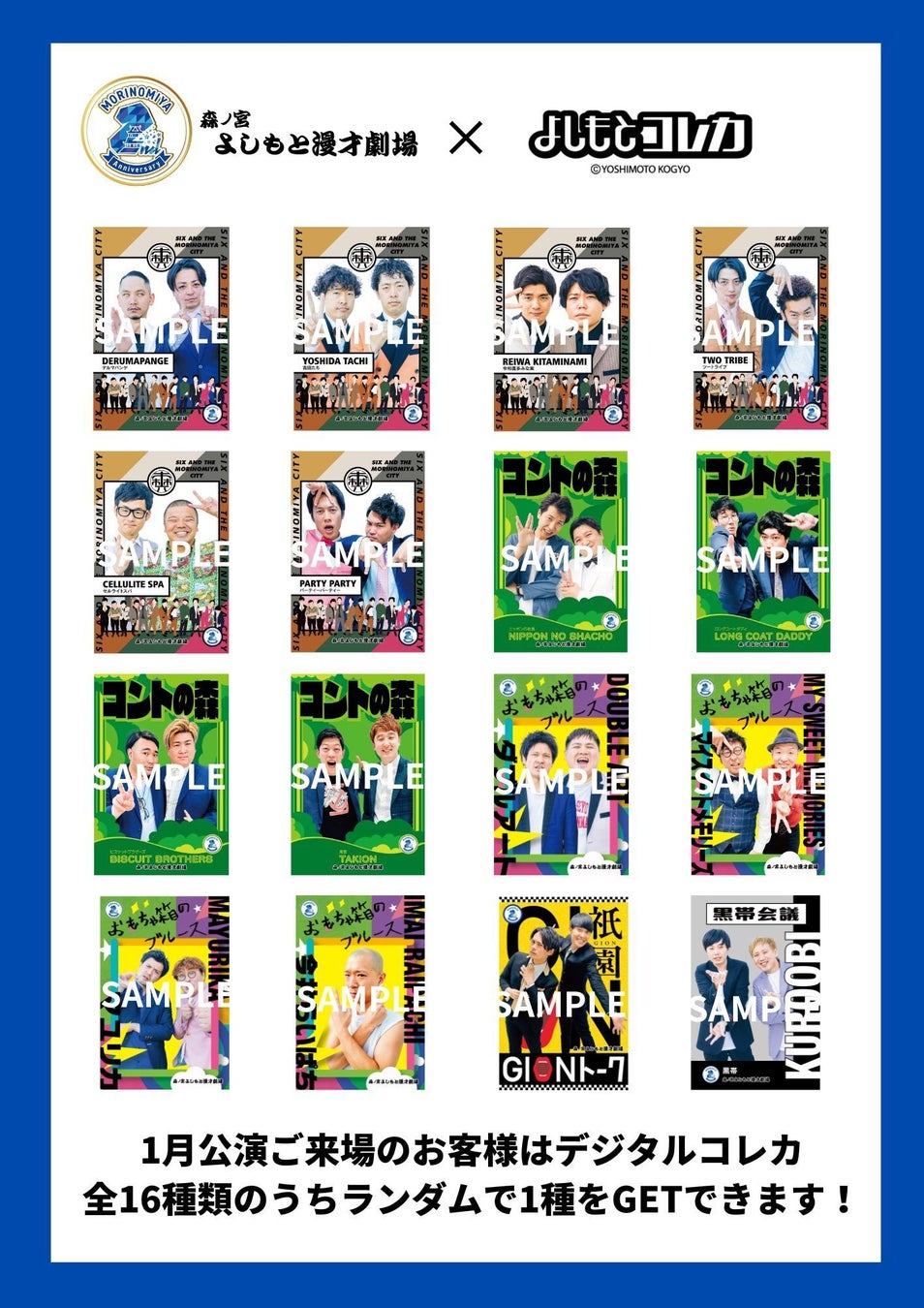 2023年1月1日(日)〜1月31日(火)の期間、森ノ宮よしもと漫才劇場1月公演をご観劇のお客様に、森ノ宮よしもと漫才劇場限定デザインのFANYよしもとデジタルコレカ「森ノ宮マンゲキ2nd Anniv.コレカ」全16種の中からランダムで1枚プレゼントいたします。