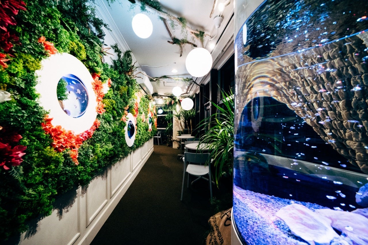 流木、貝殻、植物をレイアウトに使用したテラリウム水槽、地球をモチーフにした愛の球体水槽、熱帯魚とフラワーアレンジのコラボ、瀬戸内海を背景にした水槽、実験室を模したラボ、ステンドグラス空間の6つのエリアに分かれています。