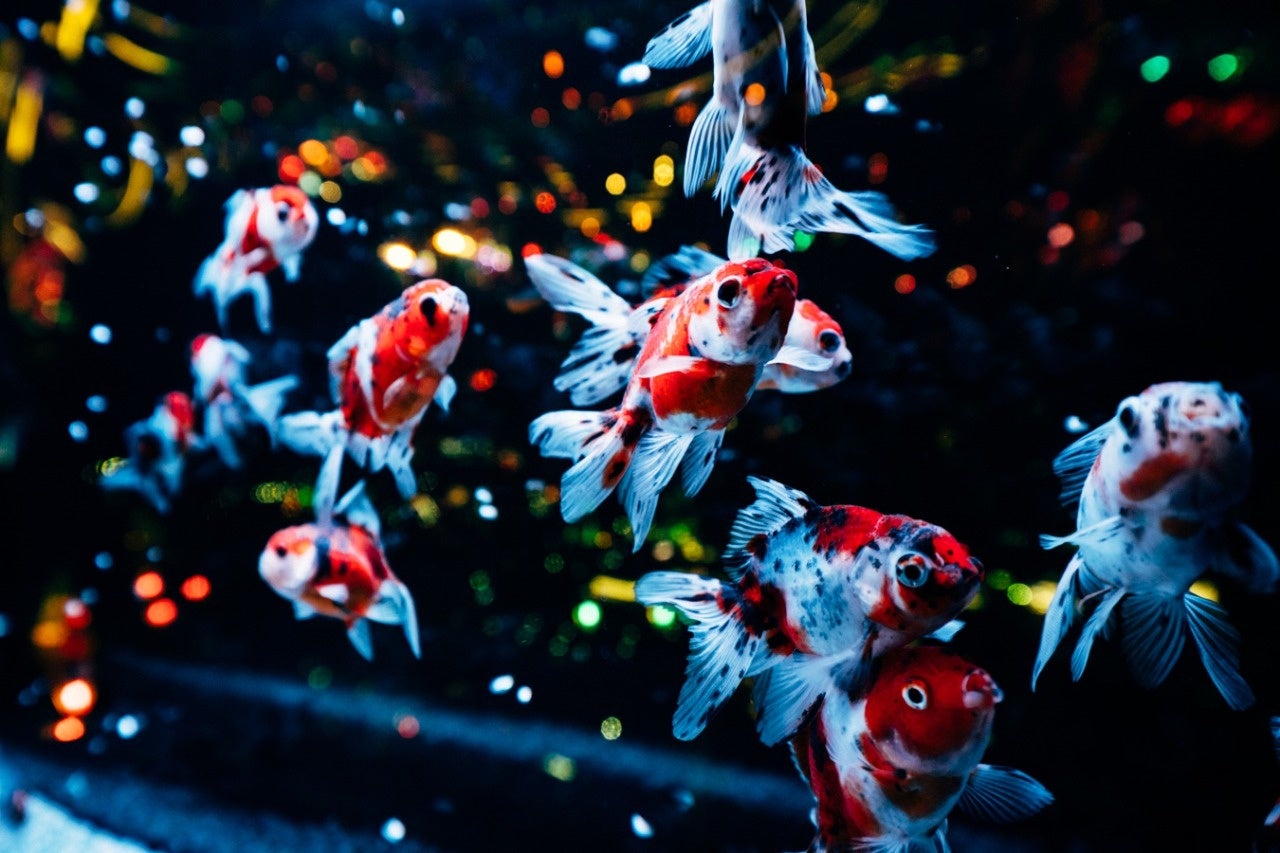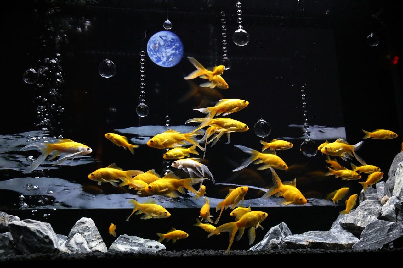 ミラーボールとアクリルとライティングを駆使したアート水槽、映像コラボ、瀬戸内海を背景にしたそらきん水槽、現代風金魚鉢水槽を使用し空間を演出しています。