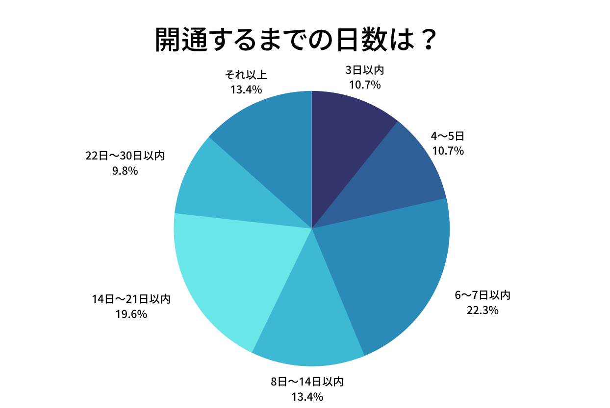 ただ全体の約76%は21日(3週間)以内に開通しています。繁忙期に契約したり、引っ越しなどの直前に契約すると開通までに時間がかかることもあります。