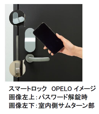 今回導入するスマートロックは、大崎電気工業株式会社製のOPELO(オペロ)です。既存の鍵を残したまま、配線工事なしで簡単に設置可能です。今後、集合エントランス用オートロックの賃貸住宅においては、スマートロックと同じ鍵で解錠可能なエントランスオートロック※3の導入も予定しています。