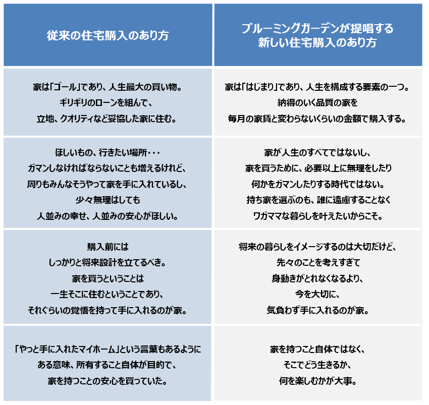 こだわろうと思えばどこまででもこだわれるのが家づくりですが、多くの人々に手の届く住まいの提供が大切と考えます。『ブルーミングガーデン』は専門工事ごとの分離発注や供給棟数日本一のスケールメリットを活かし、品質、デザインに優れ、随所に住みやすい工夫が施された家を、普通の人が普通に働いて購入できる価格帯で販売することにこだわります。