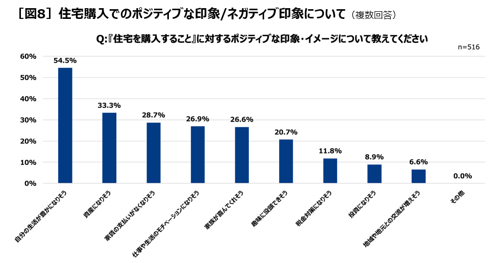 住宅購入することに対して、「生活が豊かになりそう」(54.5%)とポジティブなイメージを持っている。一方で、住宅購入することに対して、「住宅価格が高そう」(34.5%)とネガティブなイメージも持っている。