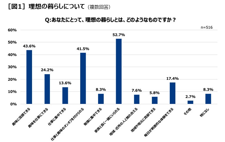 理想の暮らしは「家族と長く一緒にいられる」(52.7%)に続いて、「趣味に没頭できる」(43.6%)、「仕事と趣味のオンオフをつけられる」(41.5%)など趣味に関する項目が上位に。
