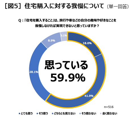 住宅を購入することは、自分の趣味や好きなことを我慢しなければ実現できないと思っているのかを聞いたところ、「思っている」が約6割(59.9%)となり、新世代は経済面などを背景に、“住宅購入=自分の趣味や好きなことを我慢・犠牲にしないといけない”と思っていることが分かりました。[図5]