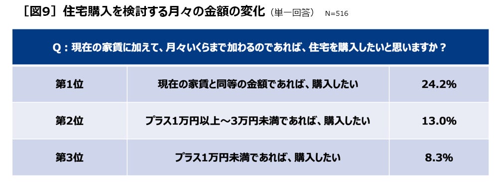 現在の家賃に加えて、月々いくらまで加わるのであれば、住宅を購入したいと思うのかを聞くと、「現在の家賃と同等の金額であれば、購入したい」(24.2%)が最多でした。次いで、「プラス1万円以上~3万円未満であれば、購入したい」(13.0%)、「プラス1万円未満であれば、購入したい」(8.3%)となりました。[図9]