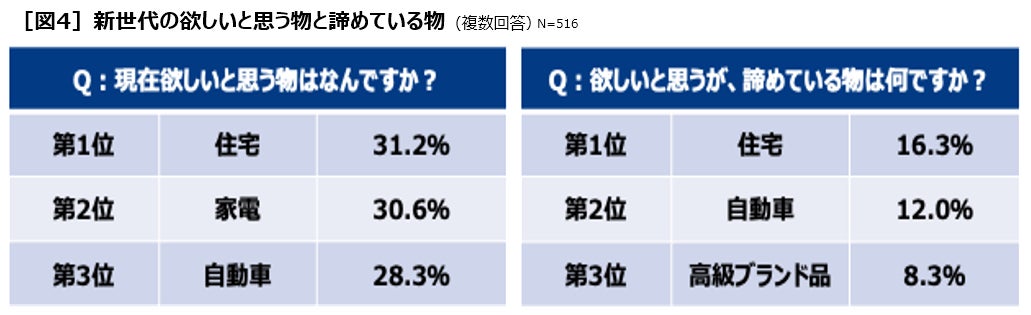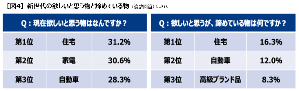 現在欲しいと思う物を聞いたところ、第1位は「住宅」(31.2%)でした。一方で、欲しいとは思うが諦めている物について聞いたところ、こちらも第1位は「住宅」(16.3%)という結果になりました。[図4]新世代は、「住宅」への強い願望と諦めの心情が入り混じっていることが分かりました。