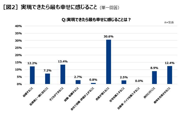 実現できたら最も幸せに感じることを聞いたところ、第1位は「資産が増えること」(30.6%)。次に多い「子どもができること」(13.4%)、「趣味を充実させること」(12.4%)と横並びとなっているのが特徴でした。[図1]従来の幸せと言われてきた「資産」「子ども」に加え、「趣味」が入っていることは、“自分の楽しさ”や、“やりがい”を重視する新世代の傾向なのかもしれません。 [図2]