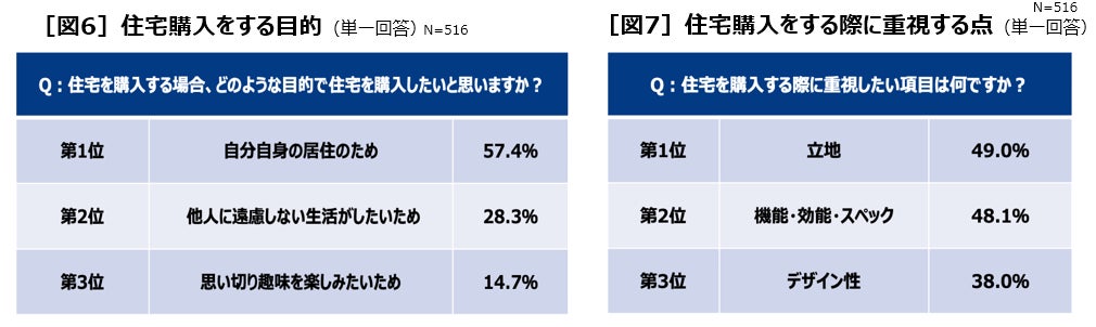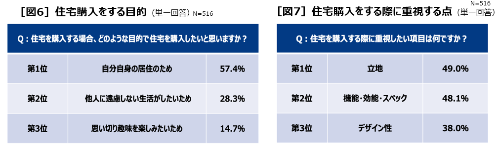 住宅購入する目的の第1位は、「自分自身の住居のため」(57.4%)。 住宅購入する際に最も重視したい項目は、「立地」(49.0%)。