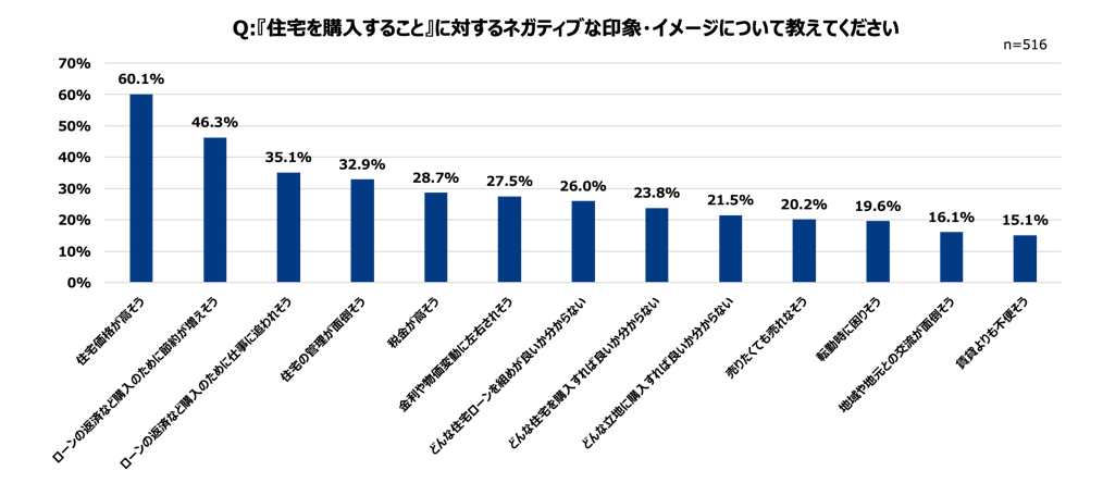 また、同様にネガティブな印象について聞いたところ、「住宅価格が高そう」(60.1%)が最多でした。次いで、「ローンの返済など購入のために節約が増えそう」(46.3%)、「ローンの返済など購入のために仕事に追われそう」(35.1%)が続き、お金に関する項目が上位にランクインしました。つまり、新世代においては、住宅購入は、“生活が豊かになりそう”といったポジティブなイメージを持っている半面、“お金”に関するネガティブイメージを持っていることが分かりました。[図8]