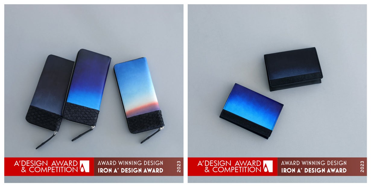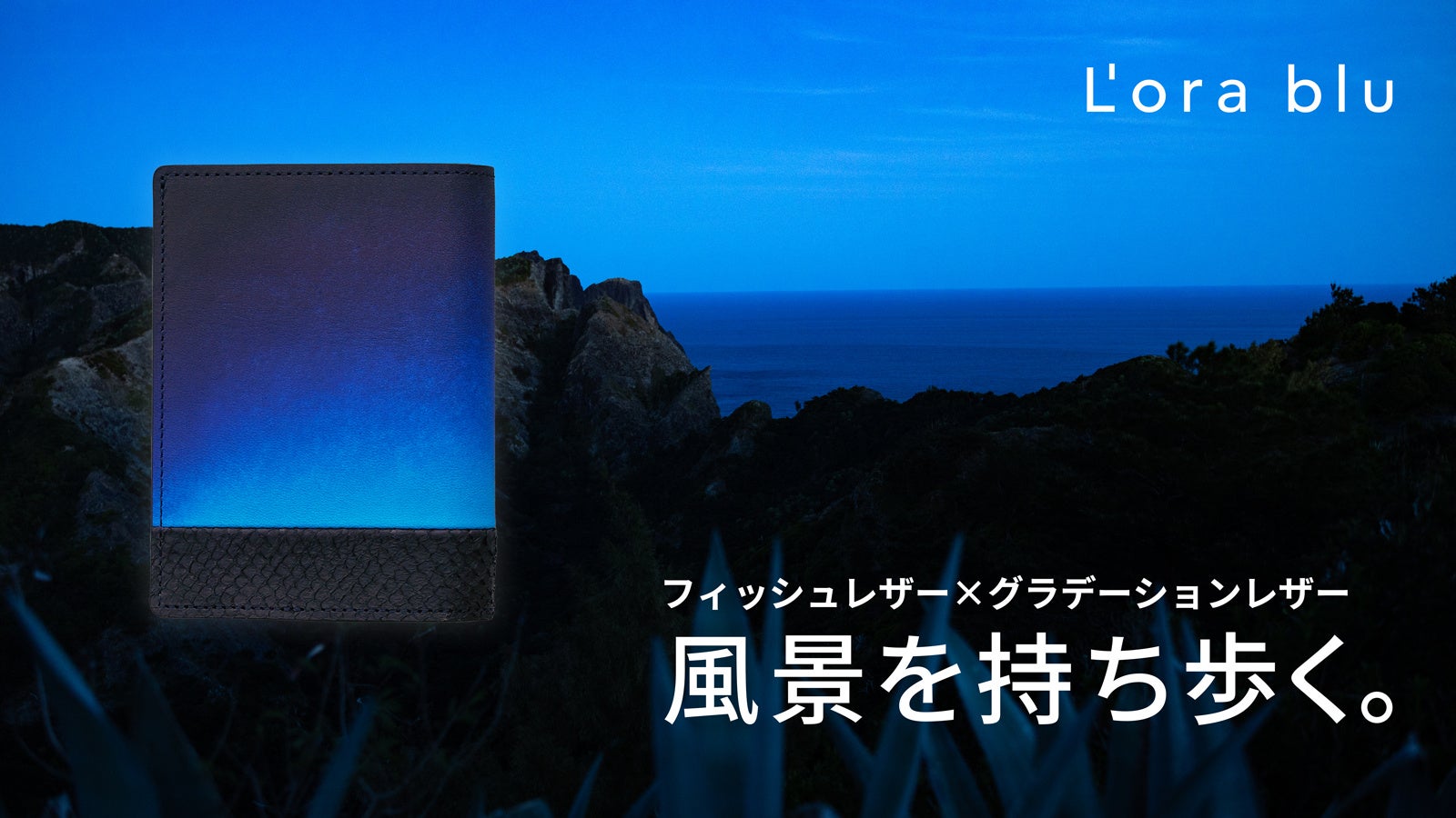 フィッシュレザーと手染めグラデーションレザーで「海と空」を描いた財布と名刺入れ