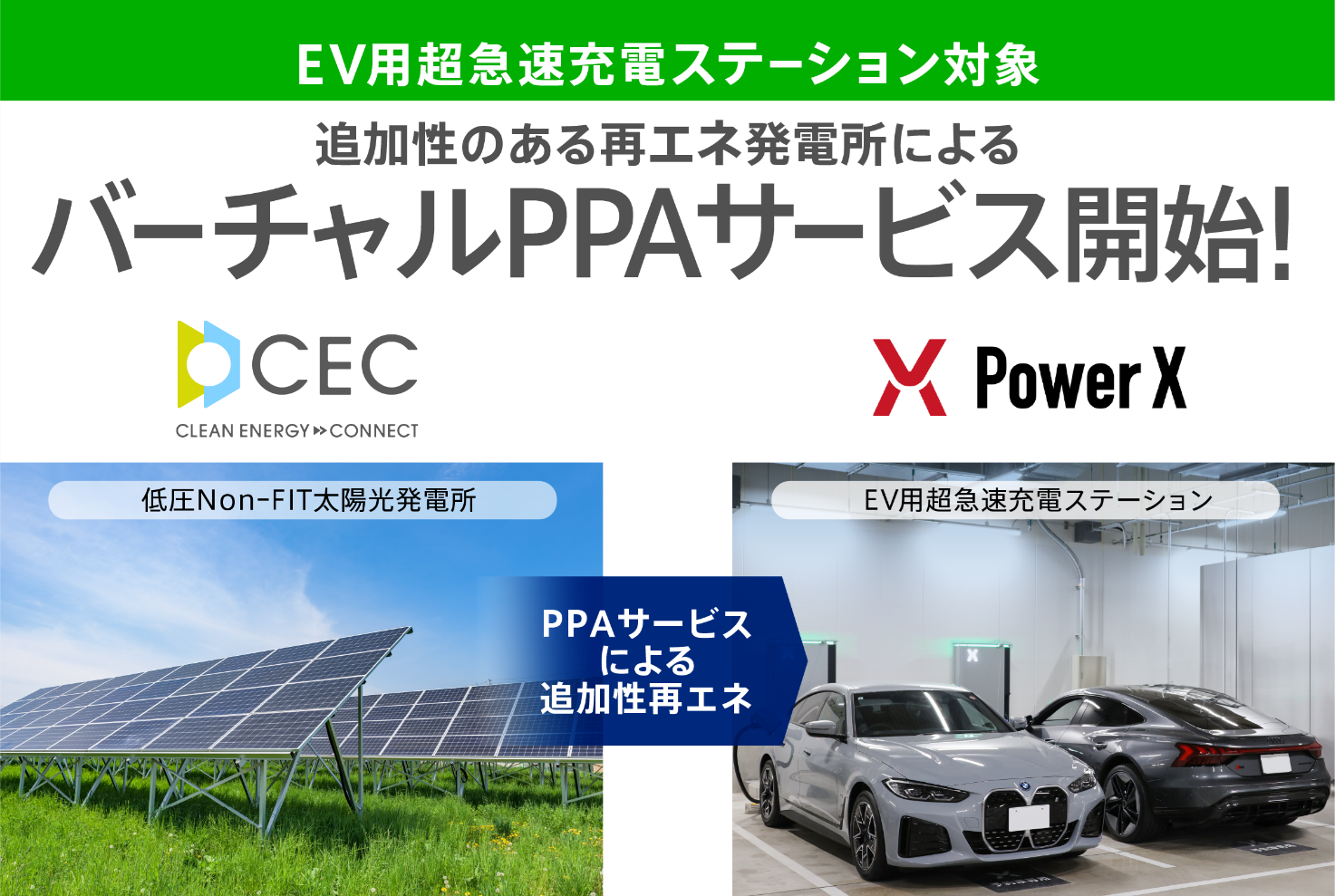 脱炭素経営企業、RE100参加企業等のお客様に対してNon-FIT太陽光発電によるグリーン電力と環境価値をお届けする株式会社クリーンエナジーコネクト(代表取締役:内田鉄平、以下「クリーンエナジーコネクト」、略称:CEC)は、株式会社パワーエックス(取締役兼代表執行役社長 CEO: 伊藤 正裕、以下、「パワーエックス」)が運営するEV用超急速充電ステーション向けにバーチャルPPAサービス契約を締結し、サービスの提供を開始いたしました。