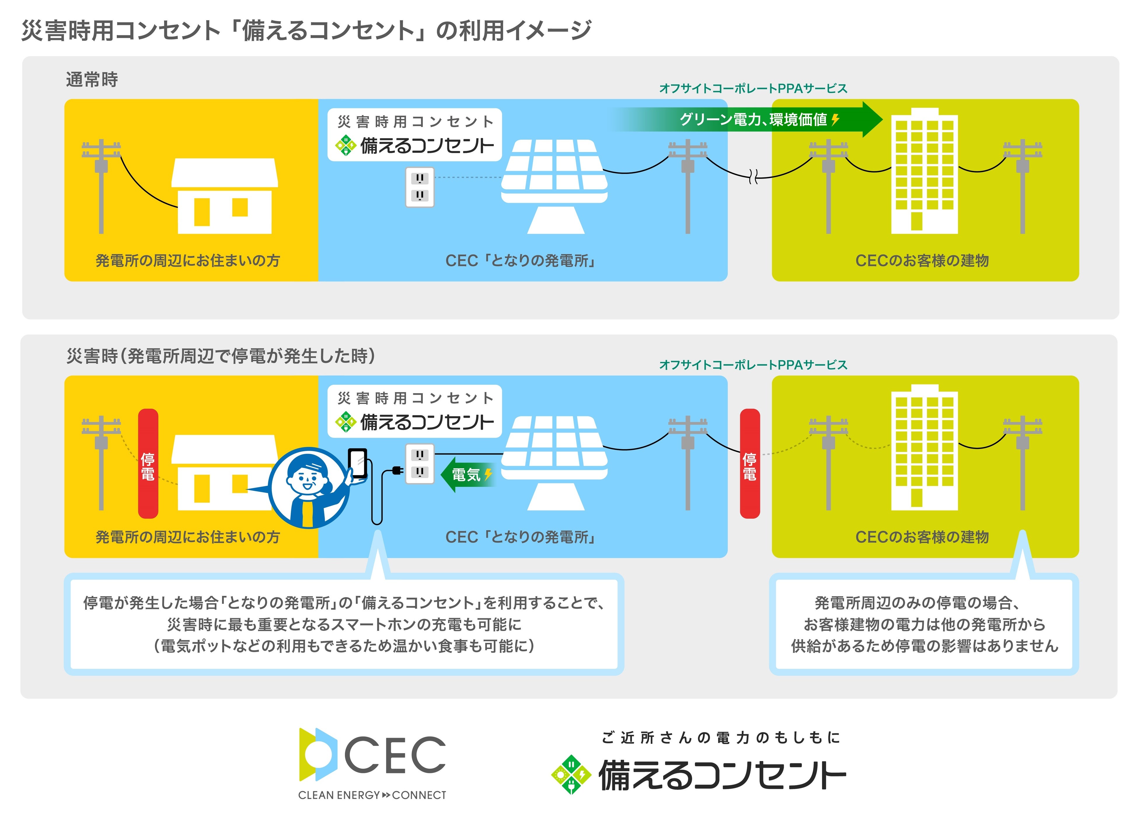 また、今回のNon-FIT太陽光発電所の一部には、発電所の設置地域で、災害等により停電が発生した際に、発電所の周辺にお住まいの地域住民の皆さまが、太陽光発電で発電した電気を利用できる災害時用コンセント「備えるコンセント™」を導入しており、発電所の設置地域のレジリエンス向上にも貢献しています。
