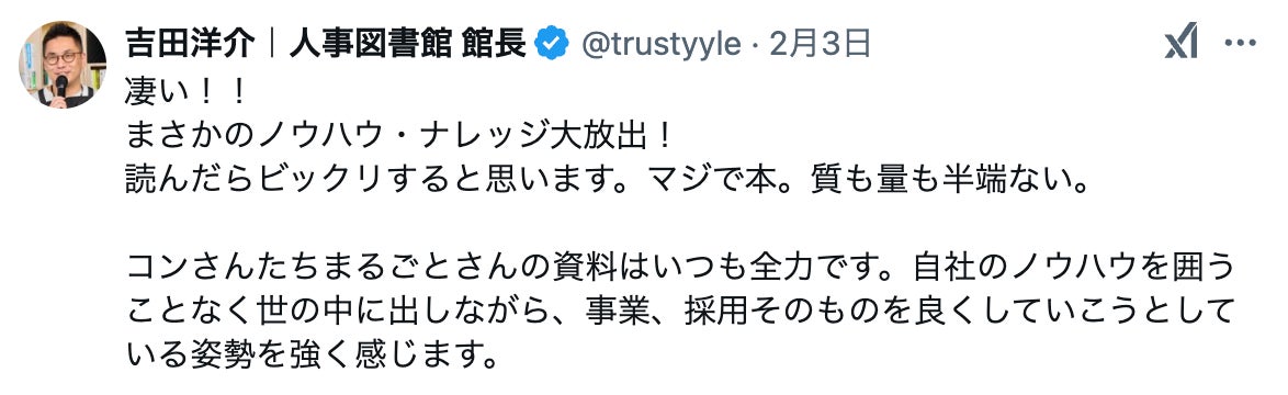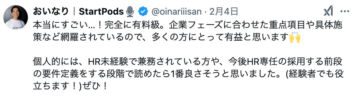 SNSを中心に採用のエキスパートの皆さまをはじめ、多くの方から「初心者から経験者まで幅広く役立つ採用ノウハウが網羅された実践的な一冊」や「無料とは思えない質と量」などの高い評価を集めています。