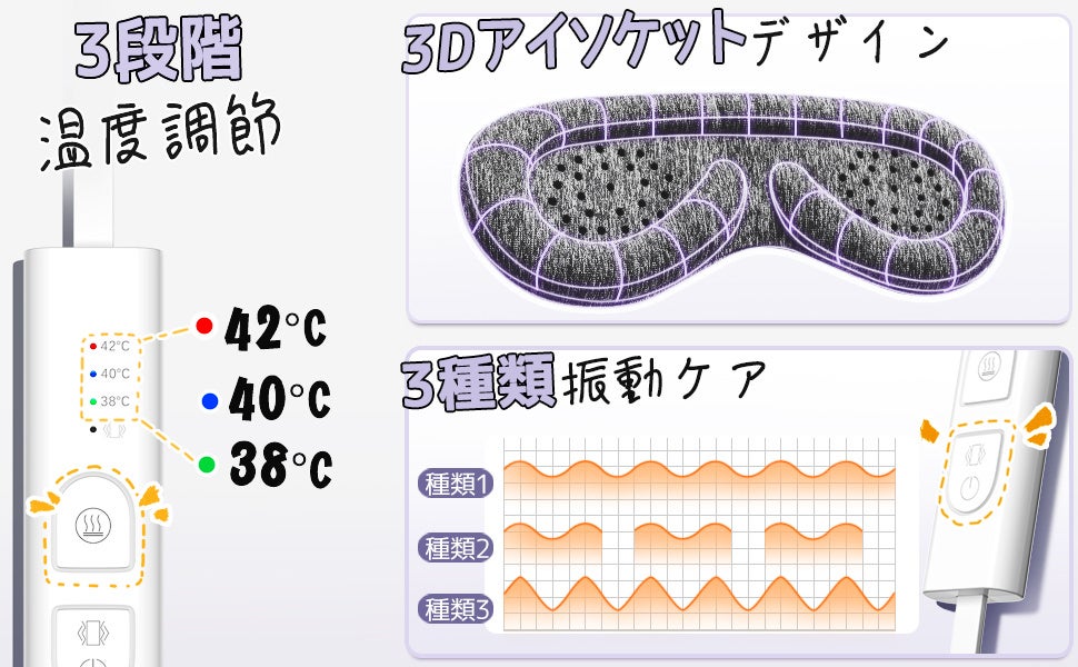 耐久性と超軽量を両立した超伝導性のグラフェン素材で、急速に加熱する。調子に合わせて38℃‐40℃‐42℃3段階心地いい温度で、毎日目を酷使しあなたの目を温めます。