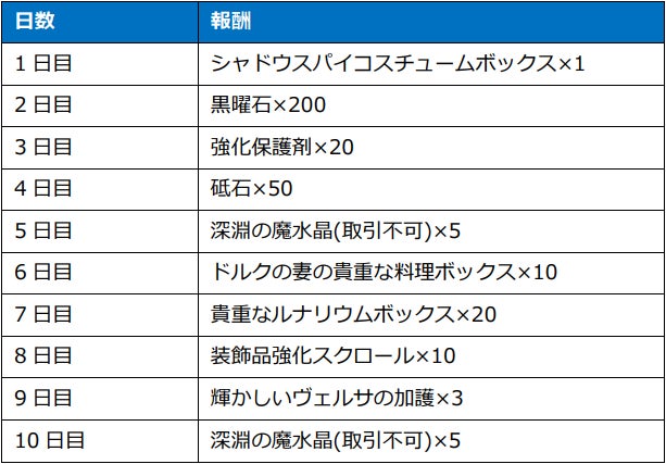 イベント期間中、10日間ログインするだけで「コスチューム」や「深淵の魔水晶(取引不可)」などをプレゼント!忘れずにログインして全ての報酬を受け取ってくださいね。