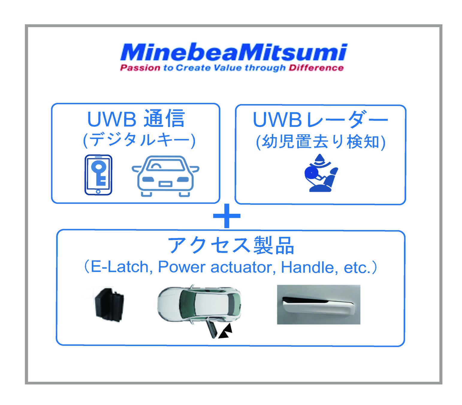 ミネベアミツミ株式会社(本社:長野県、代表取締役会長CEO:貝沼 由久 以下、ミネベアミツミ)はこのたび、UWB(超広帯域無線)技術を活用したデジタルキーシステムに容易かつコスト効率よく導入が可能な「幼児置き去り検知システム」を追加しました。世界の車内安全基準厳格化を背景に、車載ビジネス拡大に向けて開発された本システムを、10月26日(木)より開催される「JAPAN MOBILITY SHOW 2023」(主催:一般社団法人 日本自動車工業会)において、デモンストレーションとともに初公開します。