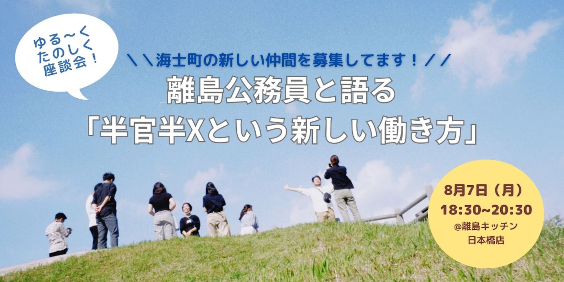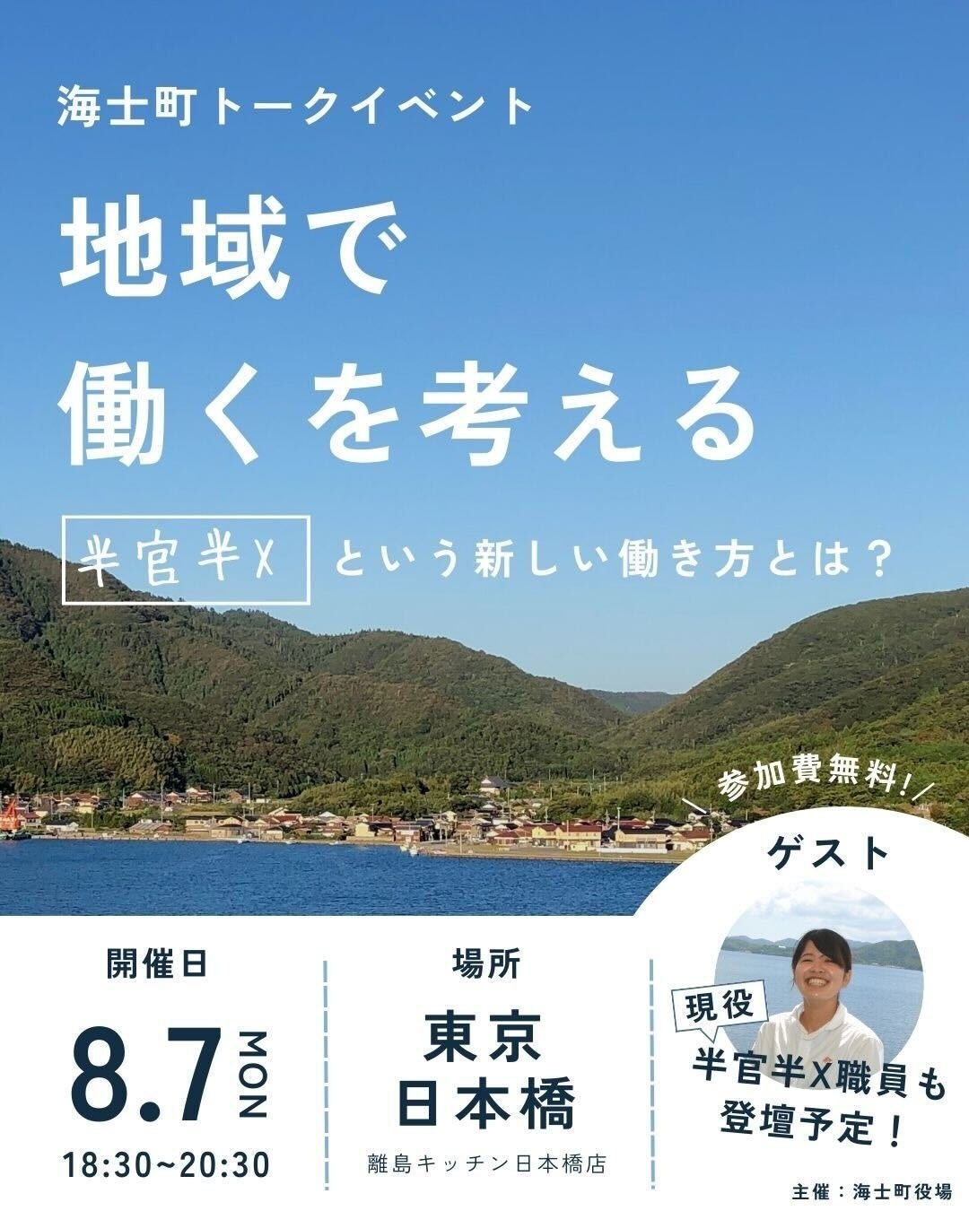 【海士町役場】【交流×挑戦】8月7日(月)離島キッチン日本橋店(東京)にて、海士町役場職員との交流会イベント、離島公務員と語る「半官半Xという新しい働き方」を開催!