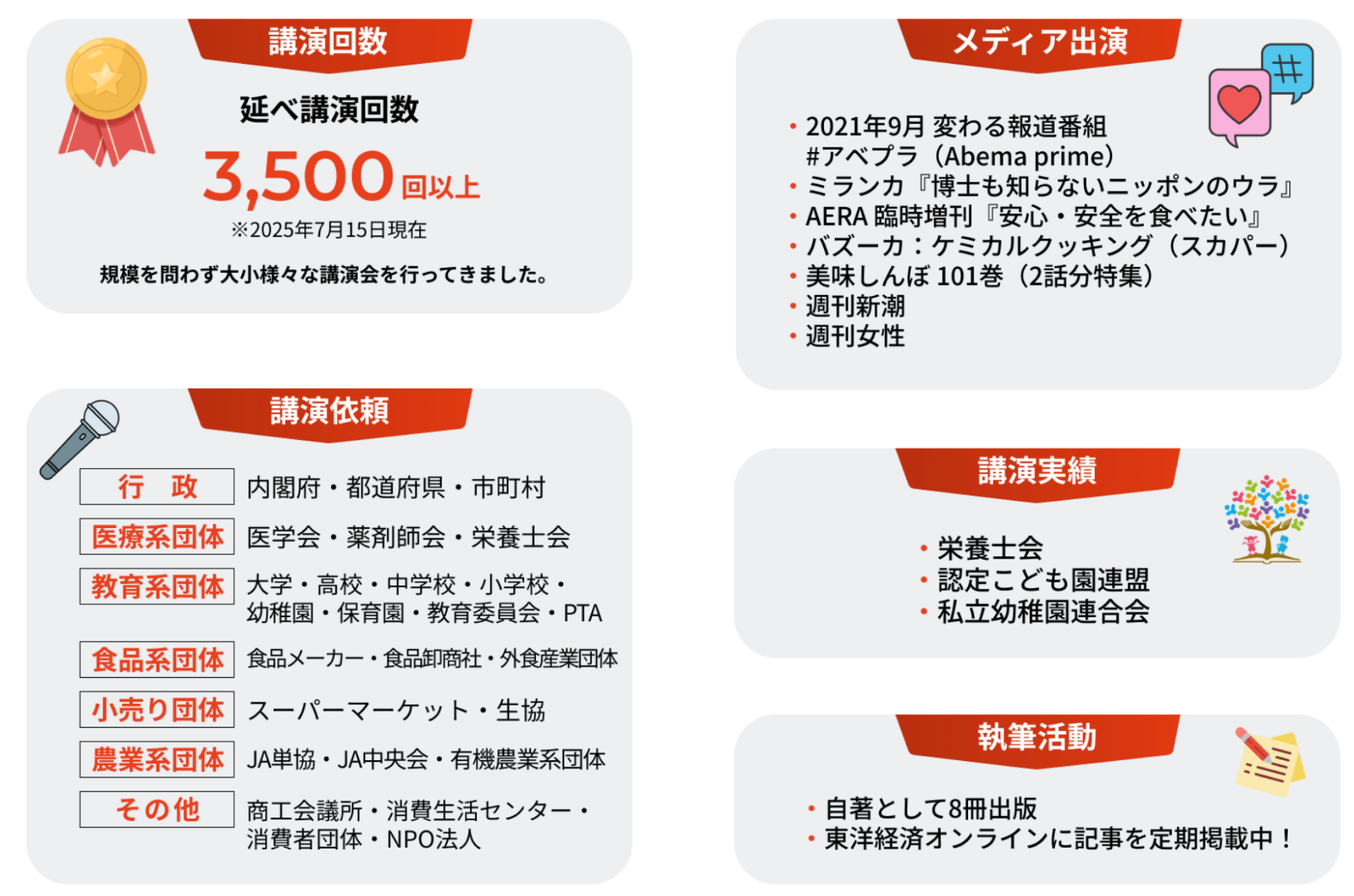 著書のシリーズ累計発行部数は90万部を超え、安全で安心できる「食」の実現に向けた啓蒙活動を続けている。