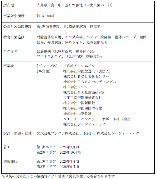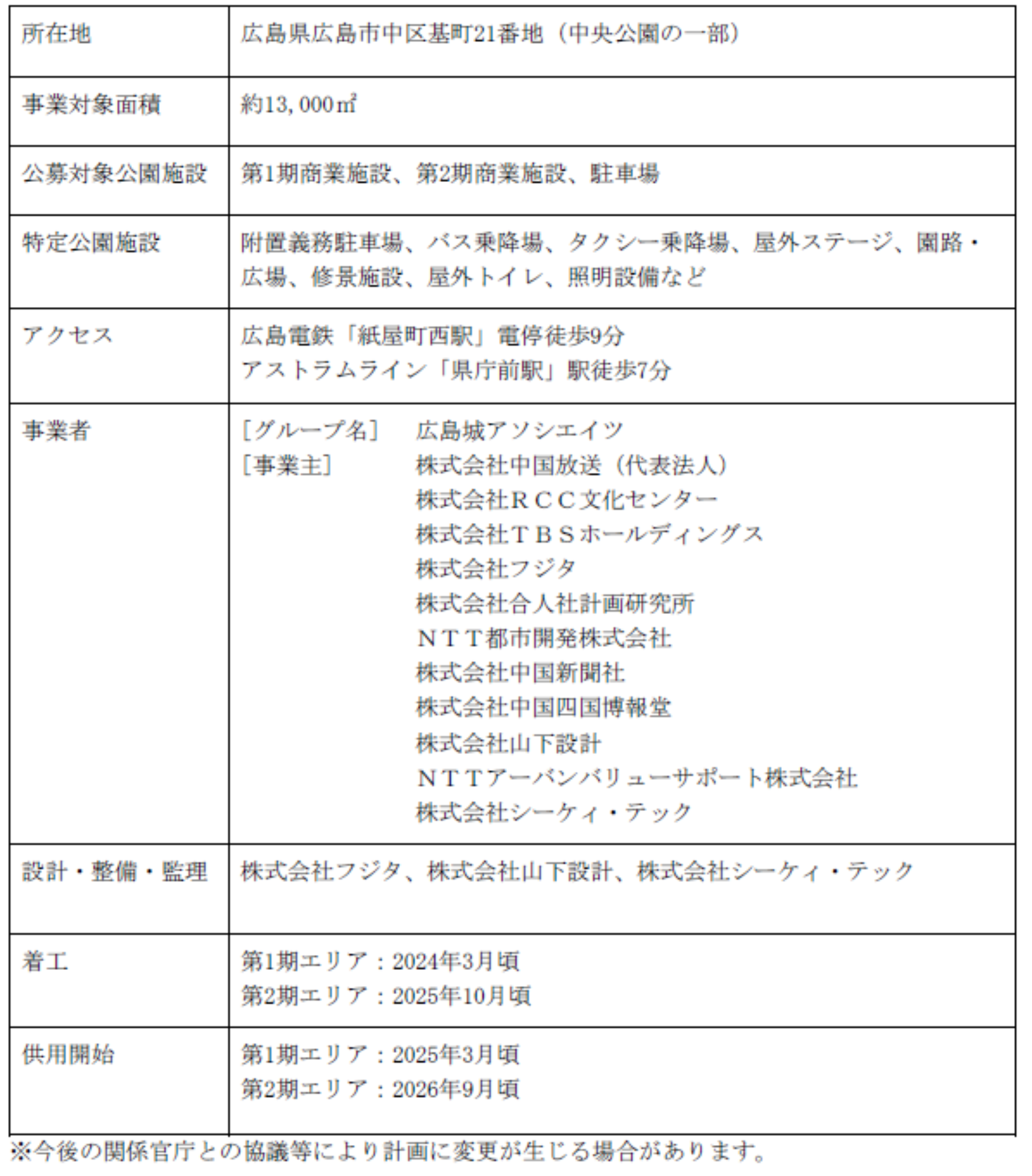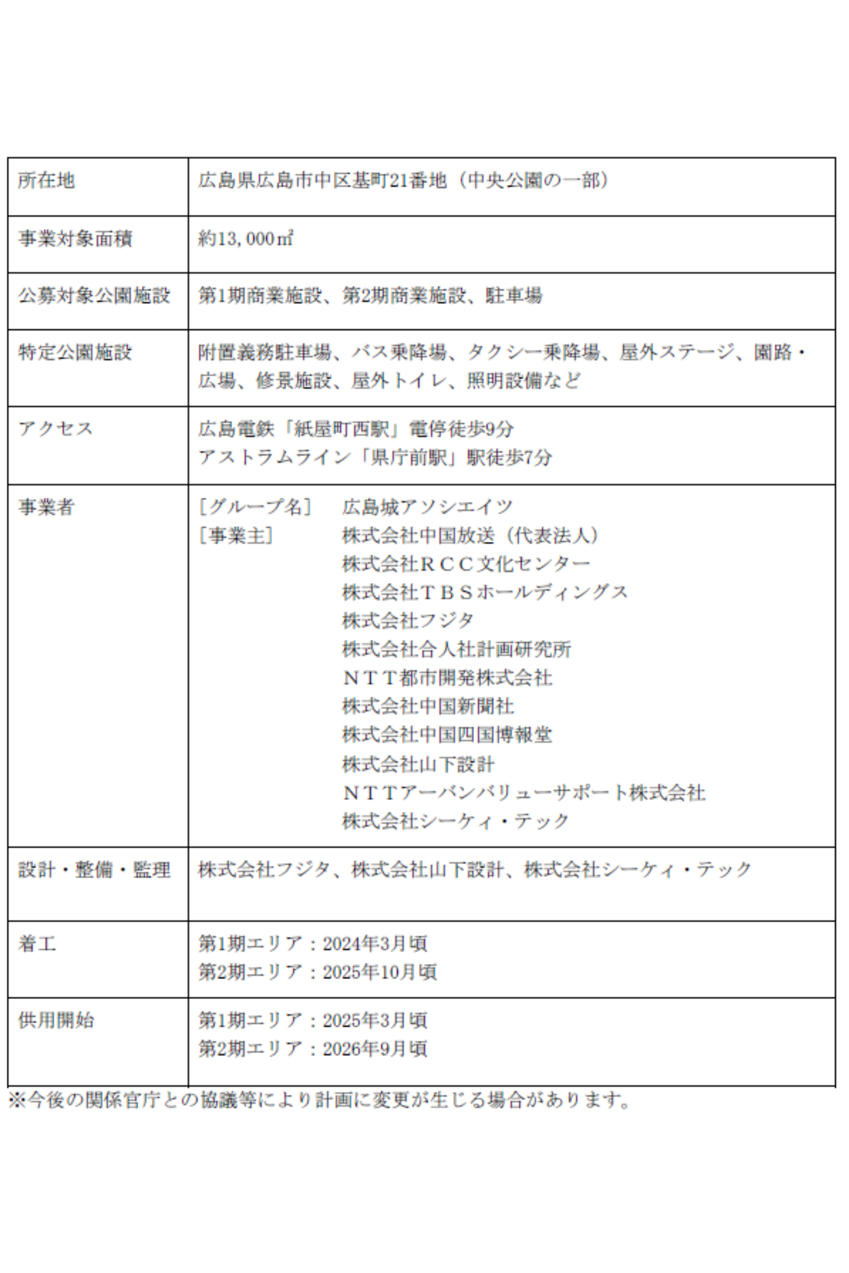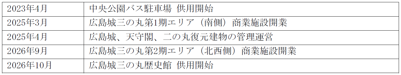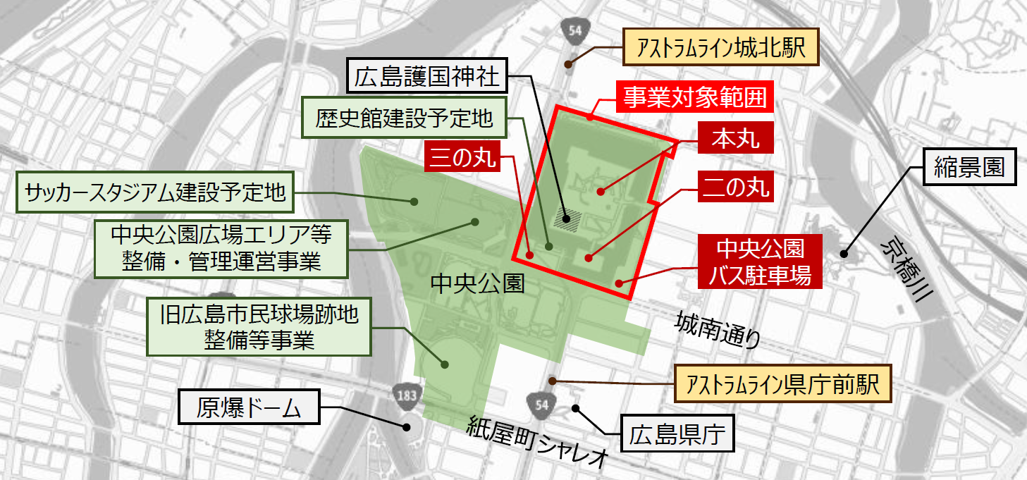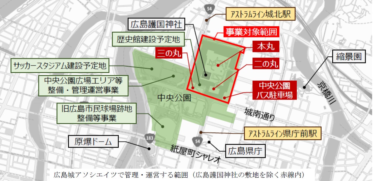 本事業は、民間の資金とノウハウを活用し、広島城三の丸における商業施設などの整備や、事業対象区域でのイベントの開催により、広島城周辺のにぎわいを創出し、都心の回遊性を高めることを目的としています。広島城アソシエイツは、「温故知新」をコンセプトとして、史跡や伝統文化の保存と継承に努め、歴史を生かした魅力ある街づくりに貢献していきます。