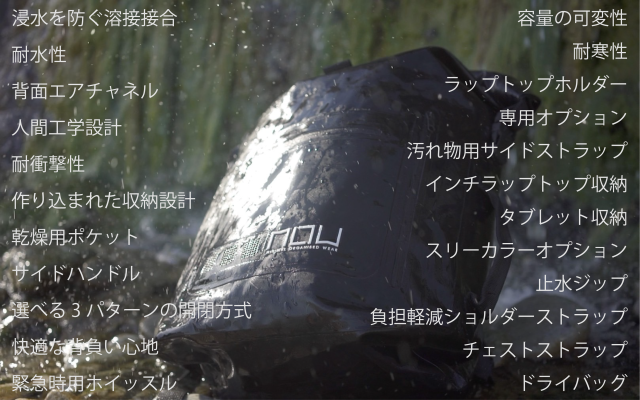 水に水没させても荒れ狂う滝に打たれても、内部へ一切の水の浸入を許さない防水機能をはじめ、23個もの機能を詰め込んだバックパック「MOW」。
