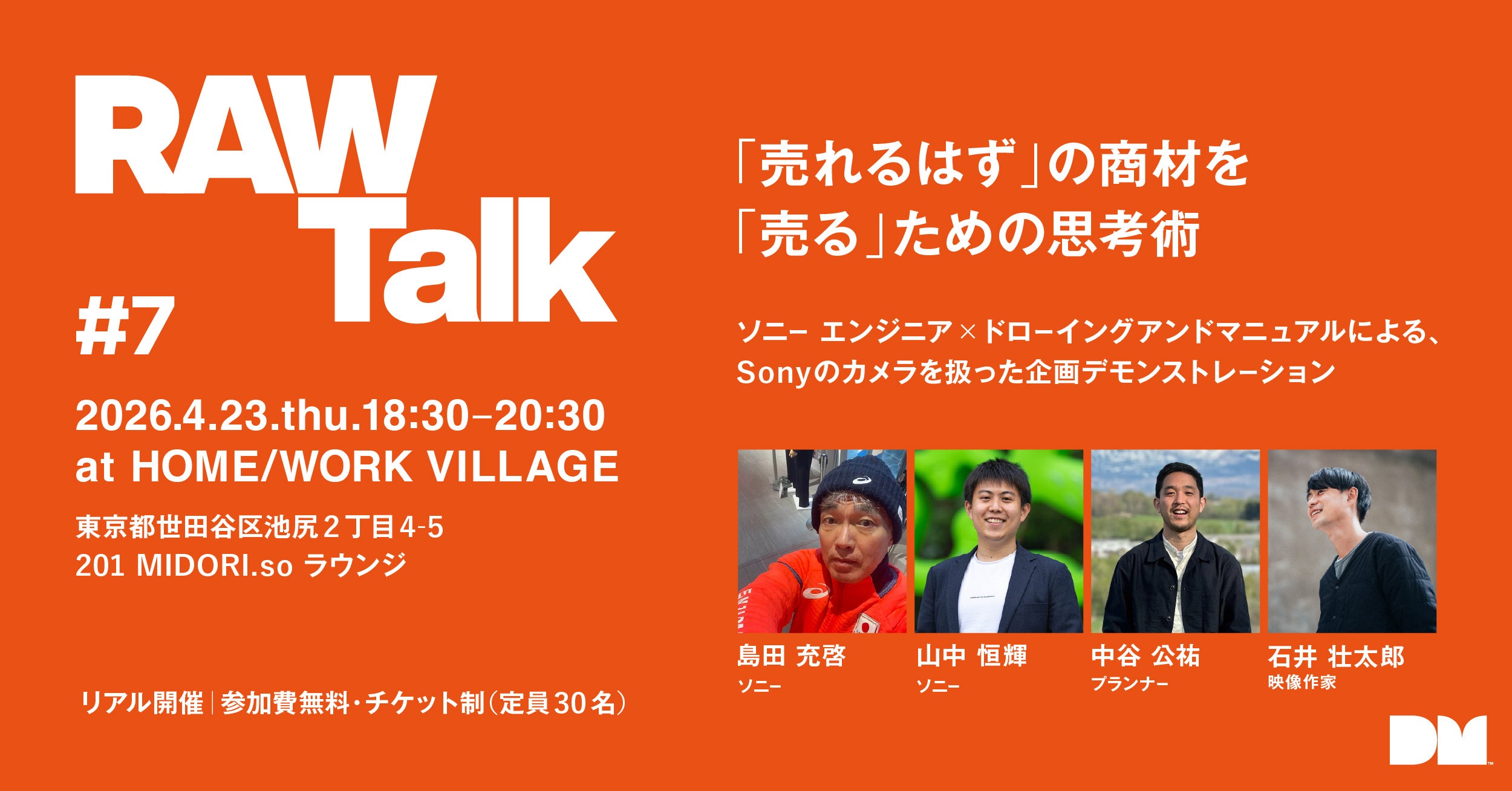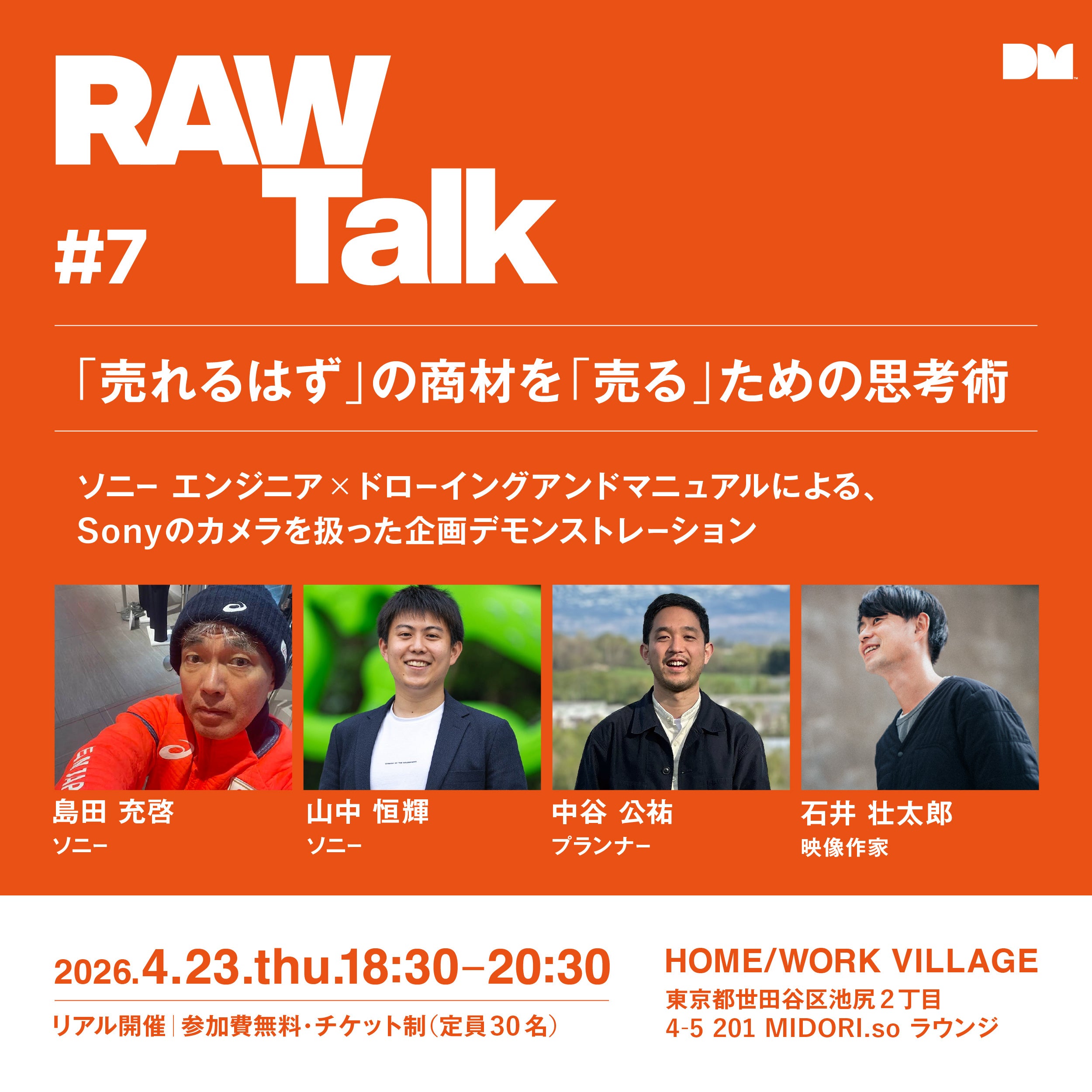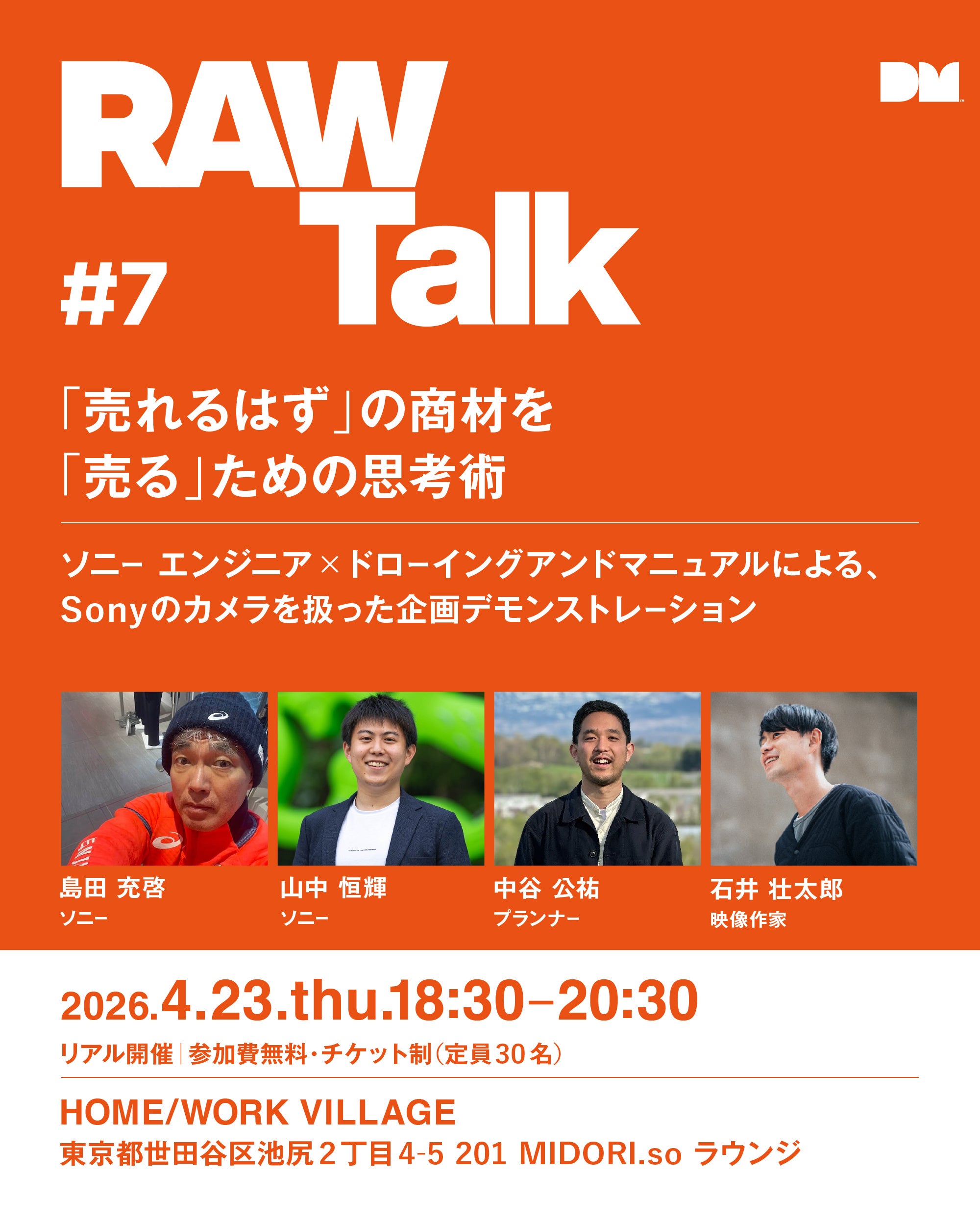 【RAW】 … 生(なま)の、未加工の、編集をしていないもの。映像業界では、未加工のデータをRAWデータと呼びます。DRAWING AND MANUALではクリエイティブが生まれるその前の考え方・きっかけ・出会いのような、生のトークを定期的に開催します。