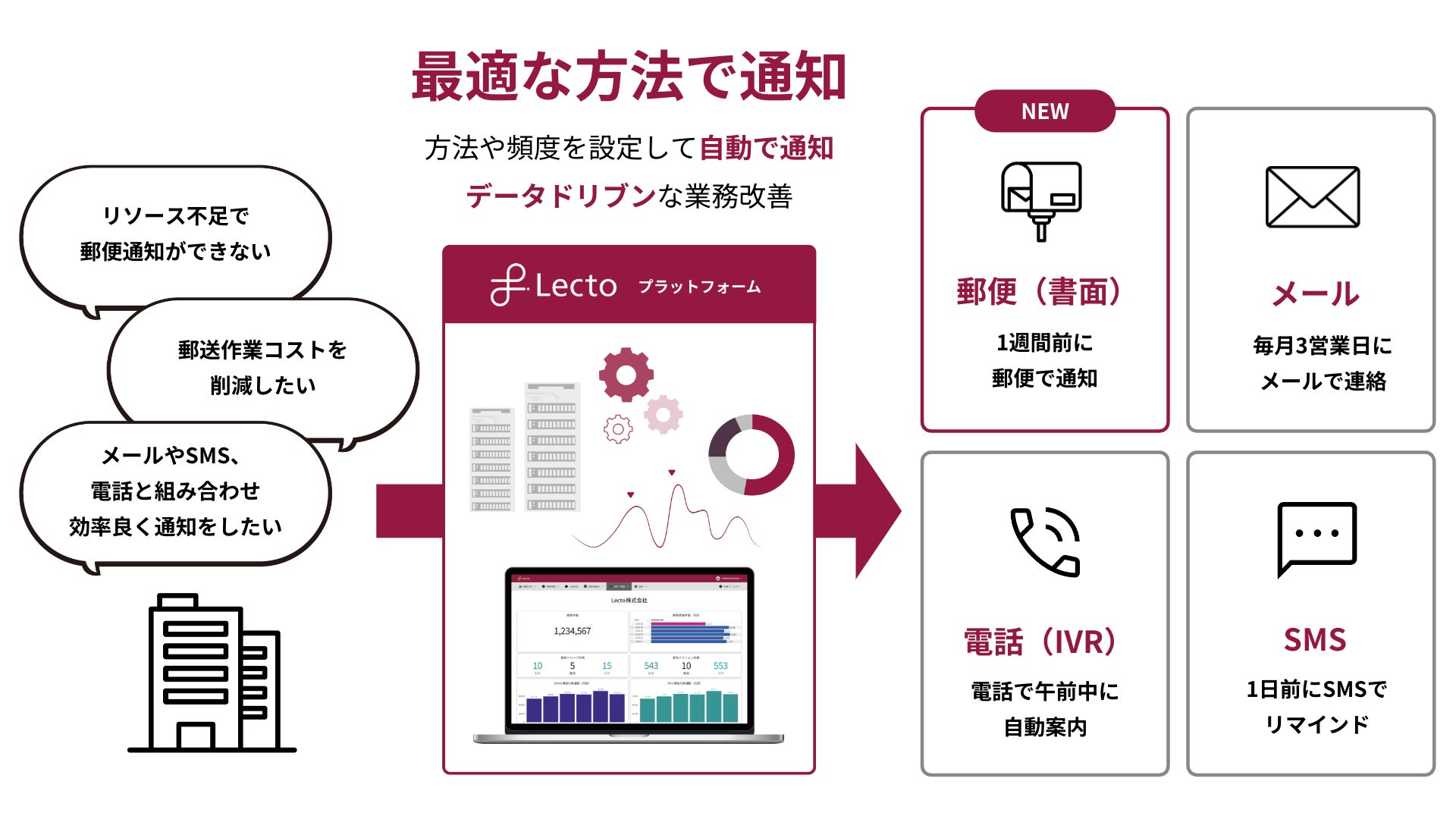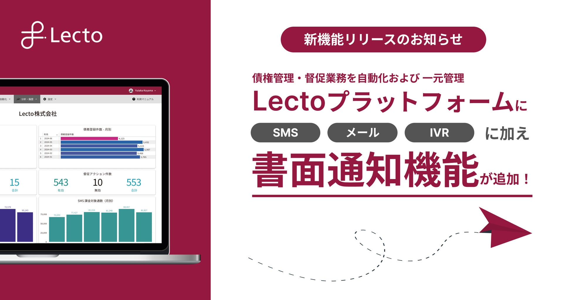 Lecto株式会社(本社:東京都渋谷区、代表取締役社長:小山裕、以下「Lecto(レクト)」)が提供する債権管理・督促業務の自動化および 一元管理ができる「Lectoプラットフォーム」は、本日より書面通知機能を追加したことをお知らせします。書面通知機能は、「Lectoプラットフォーム」上から設定をするだけで、郵便による通知が可能な機能です。