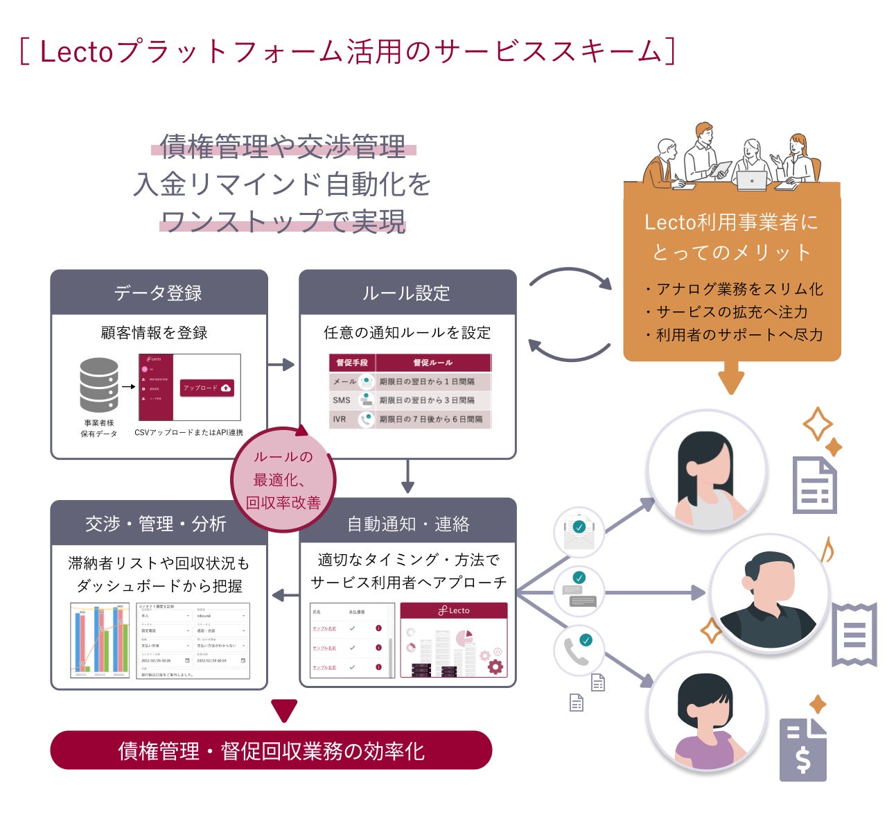 Lectoは、「督促回収テック」を展開するFintech関連企業です。金融サービスやリテール・サブスクリプションサービスの裏側(バックエンド)にある面倒な実務や複雑で属人化しやすい業務フローを改善し、債権管理(顧客管理)・回収からオフバランスまで一気通貫での課題解決を目指しています。それにより顧客満足度、サービスUXの向上を目指します。