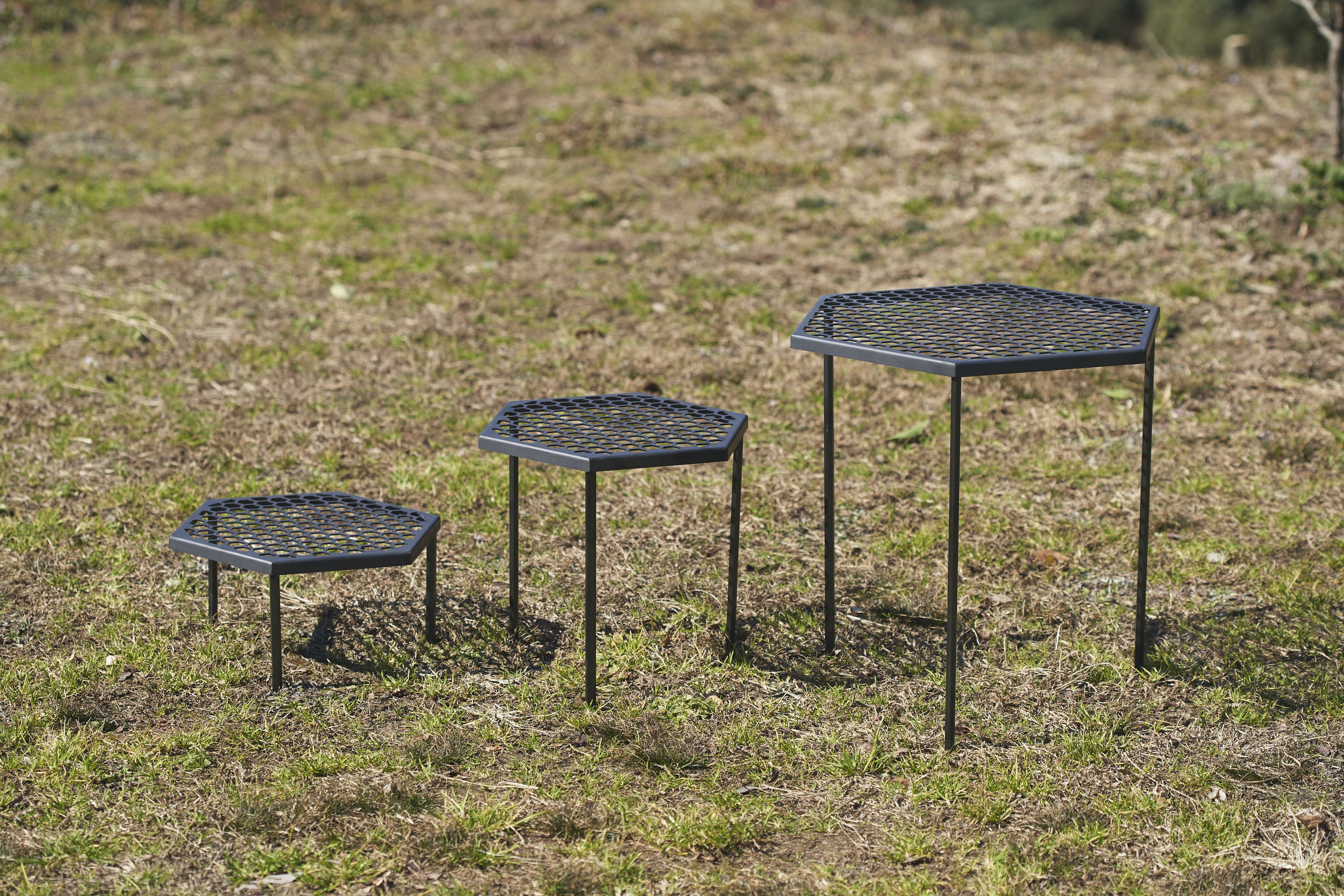 昨今、かつてないキャンプブームの真っ只中で、中でもソロキャンプというスタイルの需要が増えることで、キャンプギアもコンパクトに進化しています。もちろん焚き火台も例外ではなく、コンパクトさと軽さ、設営の手軽さに焦点が集まっています。ただ同時に、五徳の安定感のなさに不安を覚える場面も多く、「鉄」の最大の強みであるタフさと耐熱性を生かしたこの「ハニカムファイヤーテーブル」の開発に至りました。また焚き火台に重ねるように配置することで、盤面全体を大きな五徳と捉え、鉄製の耐熱テーブルとしての使用も実現しています。