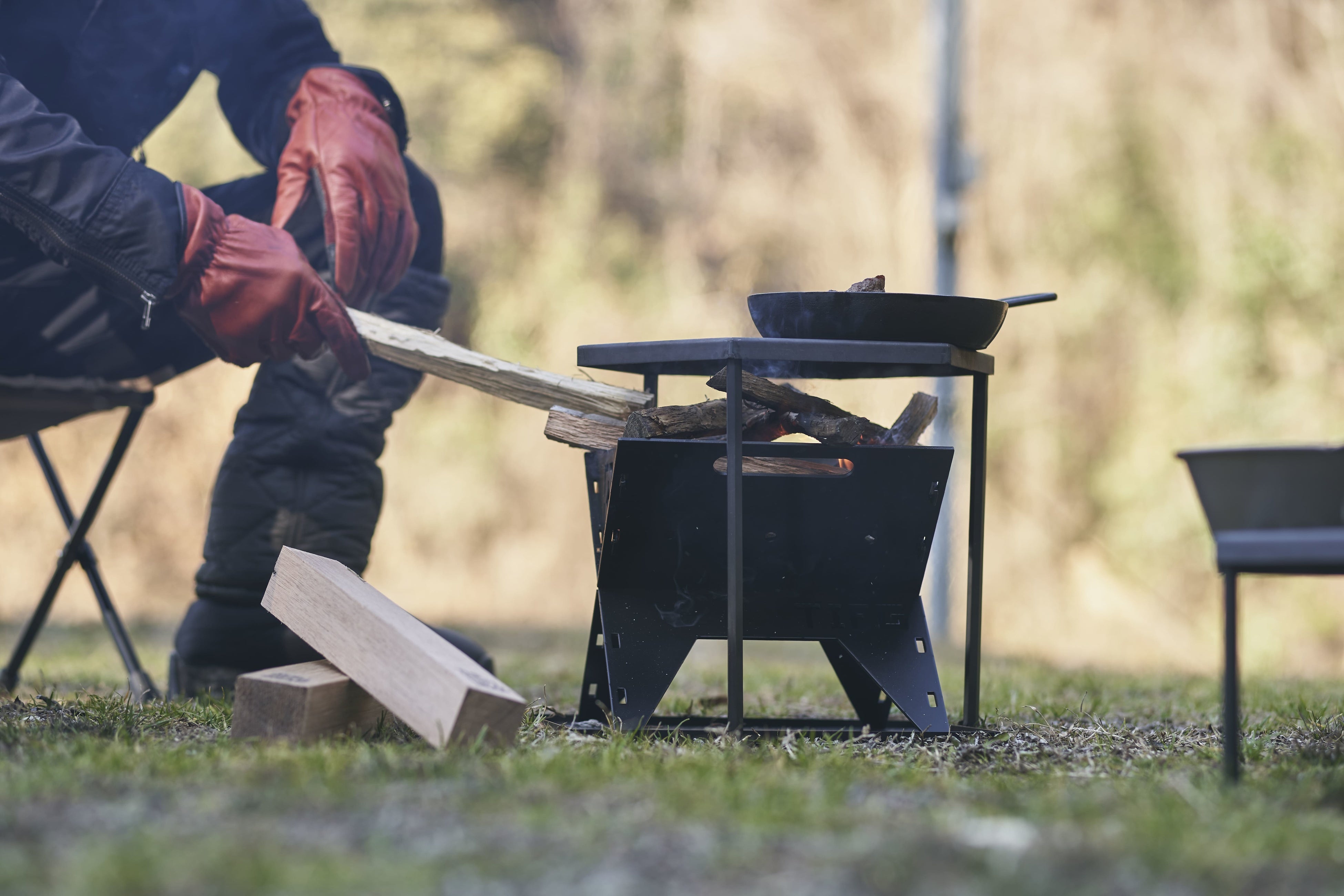 小サイズのハニカムファイヤーテーブルは、TIFGの人気焚き火台「タキビイタ(Sサイズ)」にピッタリ。調理しながら薪をくべられるので、焚き火も料理もどちらも抜かりなく楽しめます。