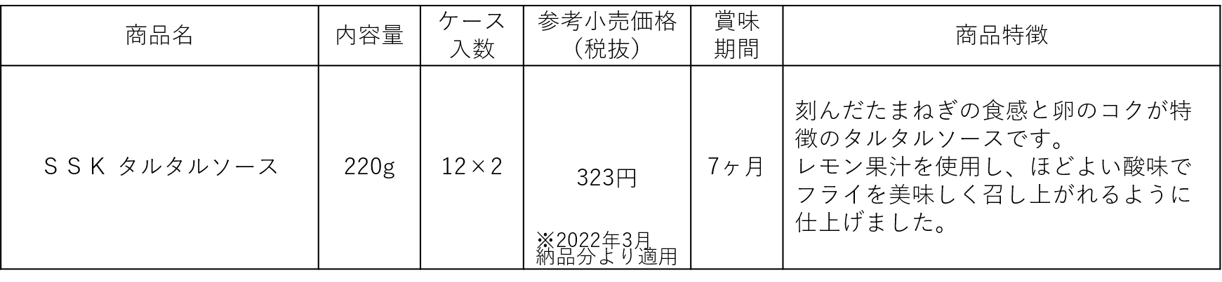 「SSK タルタルソース」は2012年に発売し、ほどよい酸味でフライを後味さっぱり食べられることでご好評をいただいております。この度、たまご感をアップし、レモン果汁を新たに加え、フライに絡みやすい粘度に改良することで、より美味しく召し上がれるように仕上げました。