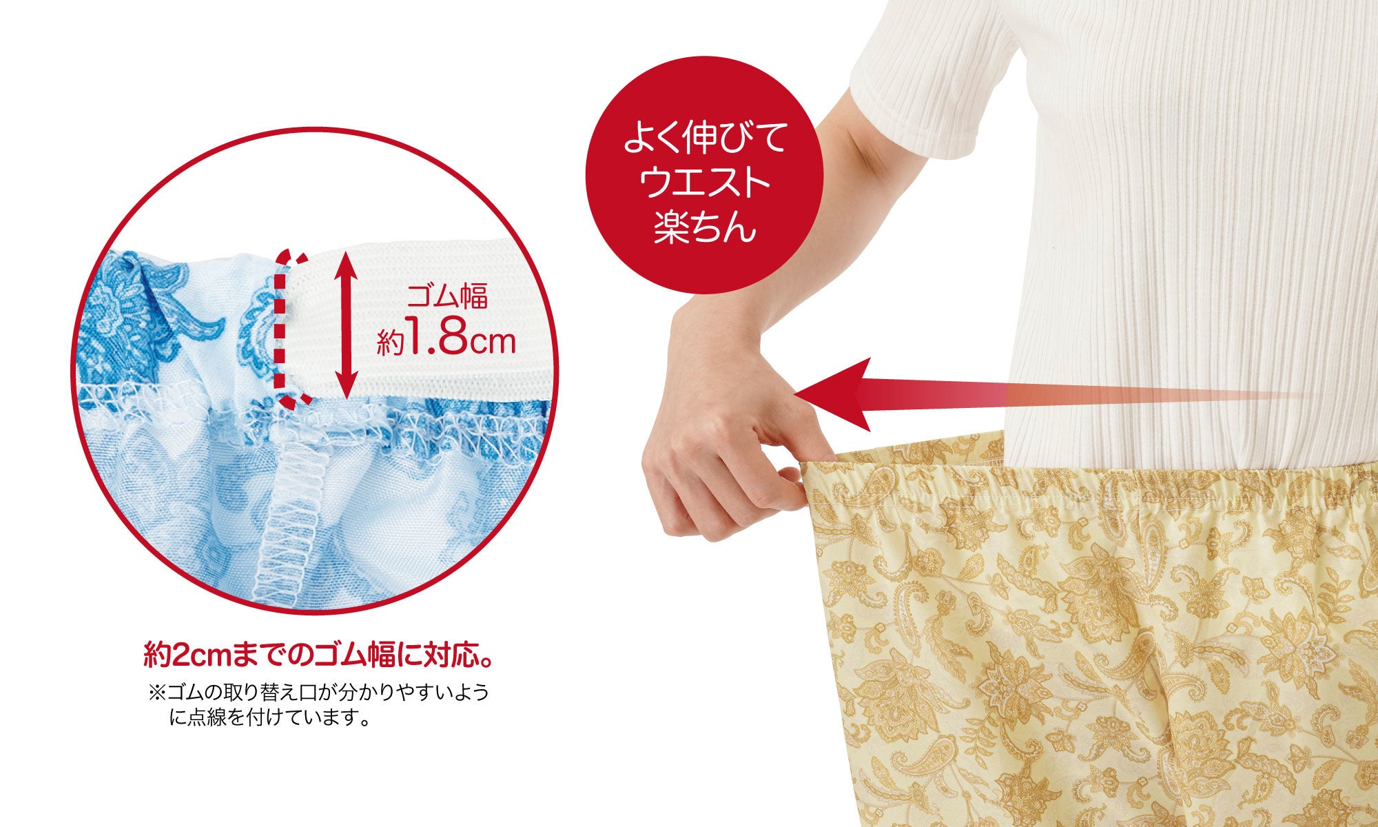 ウエスト部分のゴムは取り替え可能!サイズ感はゆったりですが、ズボンを穿いたときのシルエットはすっきりみえるデザインです。