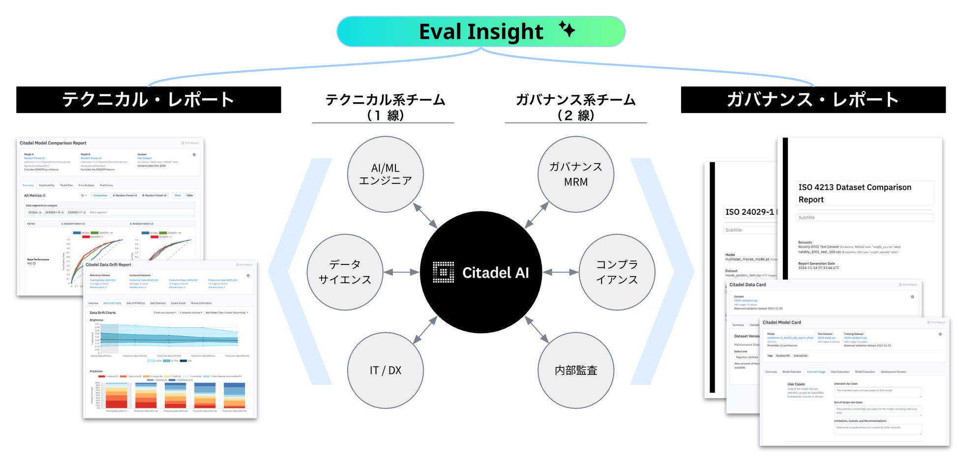 Citadel AIでは、こうした詳細なテクニカルレポートやガバナンスレポートに加え、それらのレポートを当社独自のLLMアプリケーションが自動で読み解き、重要なポイントを簡潔に取りまとめて提示するサービス「Eval Insight(イーバル・インサイト)」を提供しています。