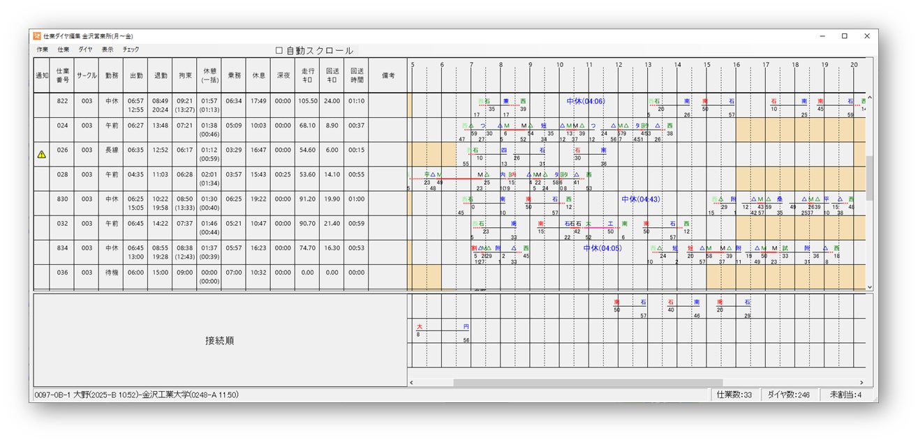 路線・系統・車両・乗務員の1日の業務計画などの基本情報を設定することで、「山ダイヤ・時刻表ダイヤ(※2)」、「仕業ダイヤ(※3)」が簡単に作成できるシステムです。本システムを利用して作成したダイヤデータは、レシップ製の機器(運行支援システム、バスロケなど)へスムーズに連携することができます。