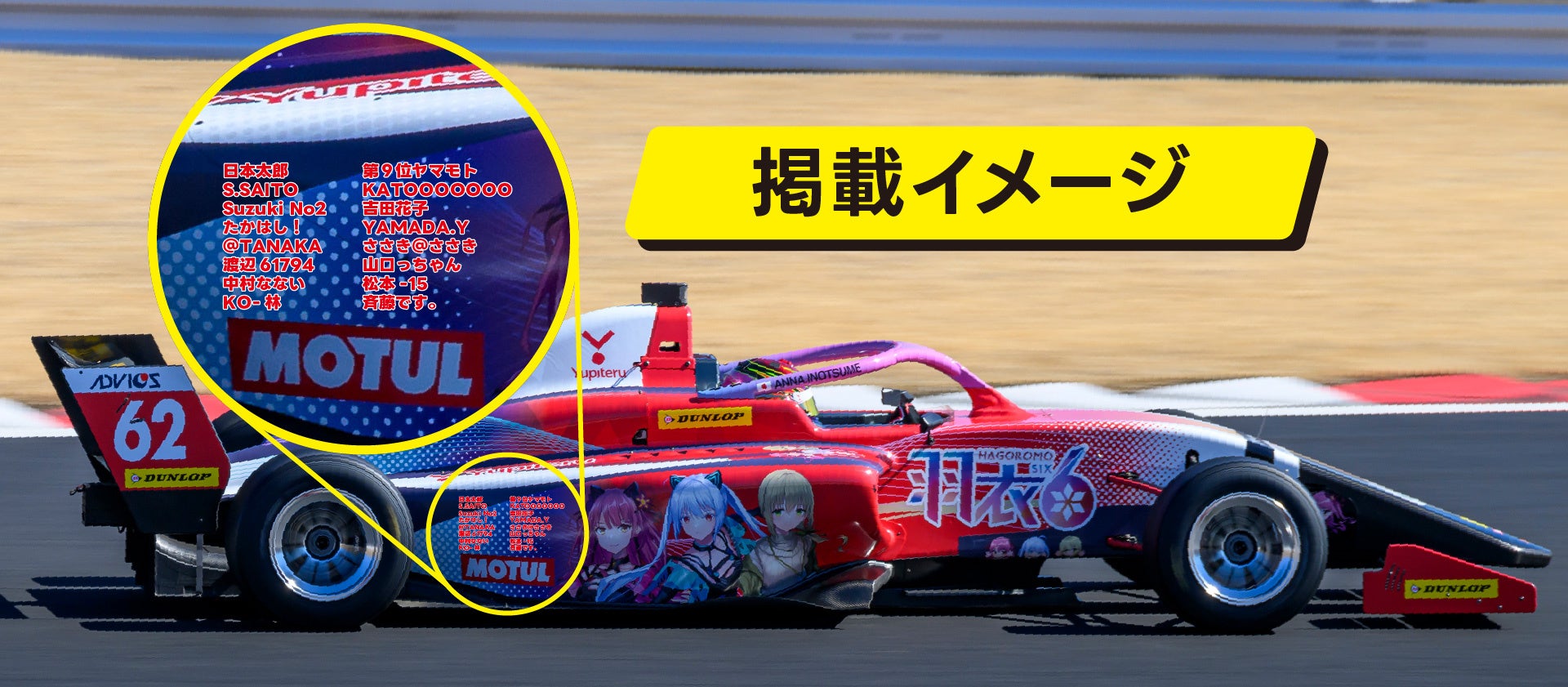 期間中、対象商品をご購入・ご応募いただいたお客様の中から抽選でフォーミュラ・リージョナル参戦中の「ユピテル 羽衣6号」にお名前(ニックネーム可)を載せられるキャンペーンを本日3月14日より実施します。