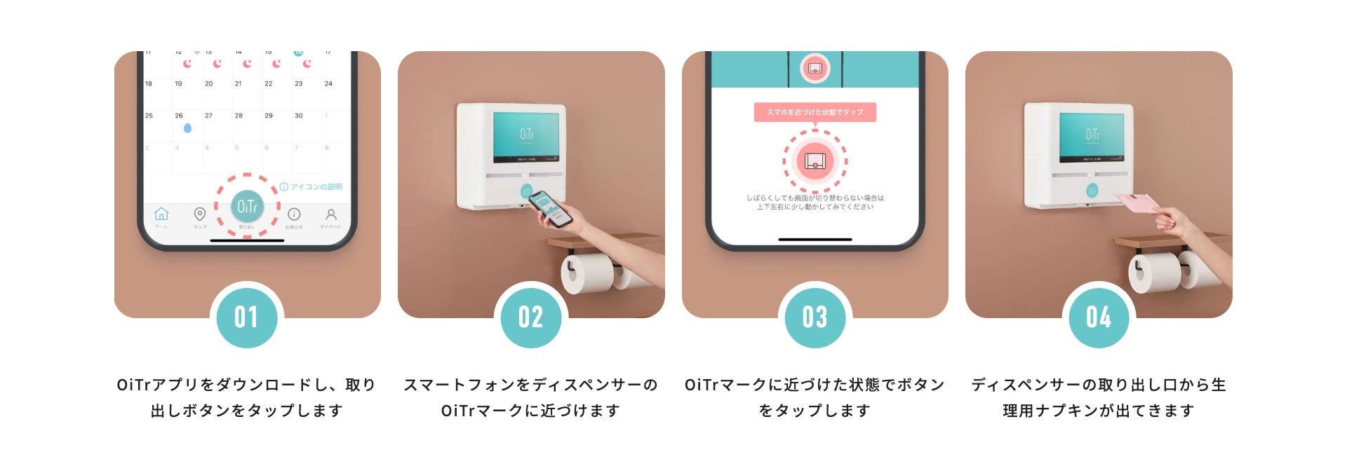 OiTrは、全国の商業施設や交通機関、公共施設、オフィス、学校などの女性個室トイレに生理用ナプキンを常備・無料提供する日本初のサービスです。専用アプリ(無料)をダウンロードし、ユーザー登録することで、2時間ごとに1枚、25日間で最大7枚の生理用ナプキンを無料で受け取ることができます。OiTrは、全国28都道府県の292施設に3,300台を設置(2025年3月時点)しています。