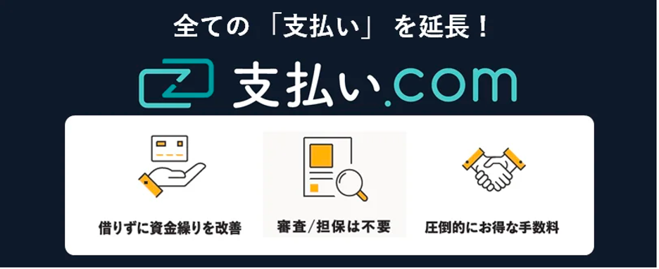 個人事業主・法人企業を対象とした「支払い.com」は、企業間の取引におけるあらゆる銀行振込のお支払いを、ユーザーがお持ちのクレジットカードで決済できるサービスです。お支払いをクレジットカードのお引落日まで延長することで、ユーザーは資金繰りの改善が可能となります。また、ユーザーは書類の提出や面談、審査は必要ありません。仕入れや外注費の支払いはもちろん、人件費や家賃の保証金等にも幅広く利用できます。