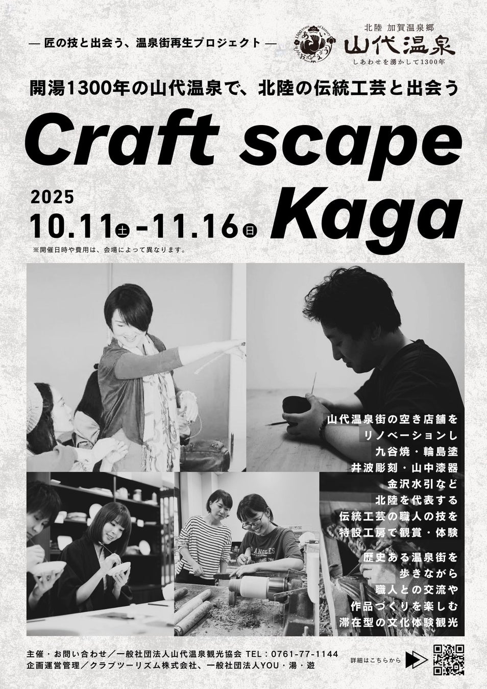 山代温泉街の空き店舗や歴史的建物を活用した工房で、職人の制作風景を間近で見学したり、技を体験できます。九谷焼、山中漆器、輪島塗など、北陸を代表する工芸の魅力にふれる貴重な機会です。