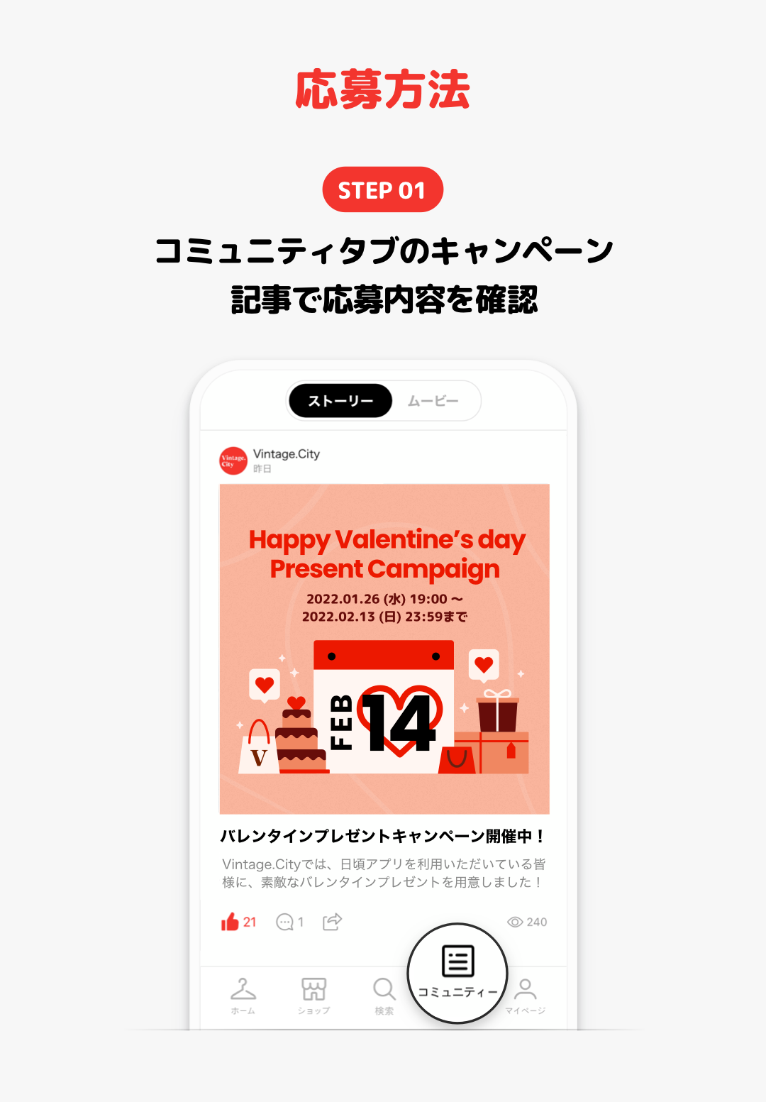 2022年1月26日(水)19:00に「Vintage.City」のアプリ内にある「コミュニティ」ページに応募要項を確認