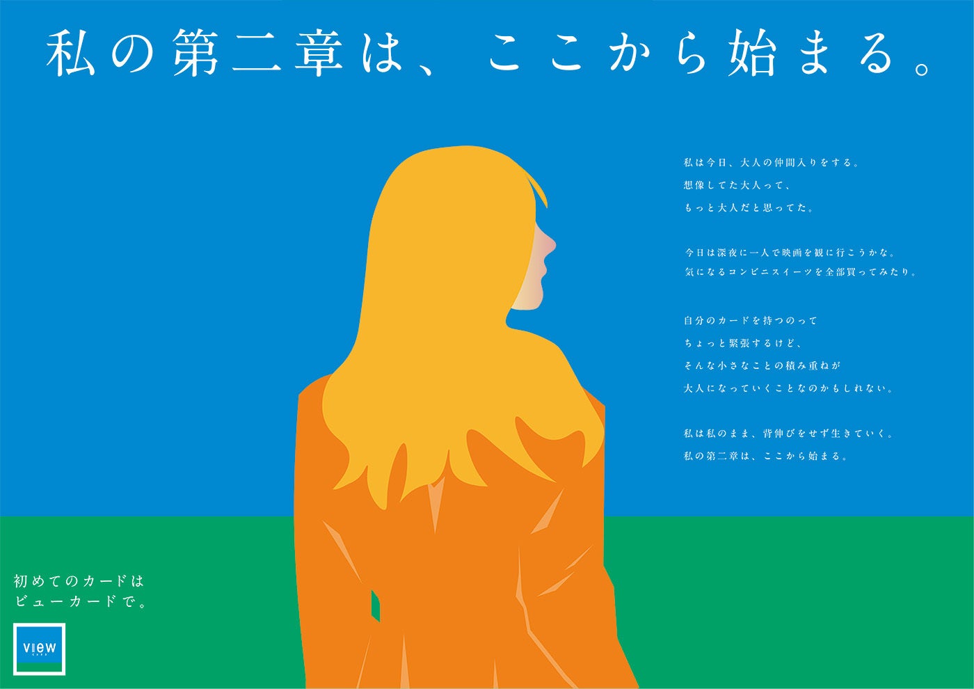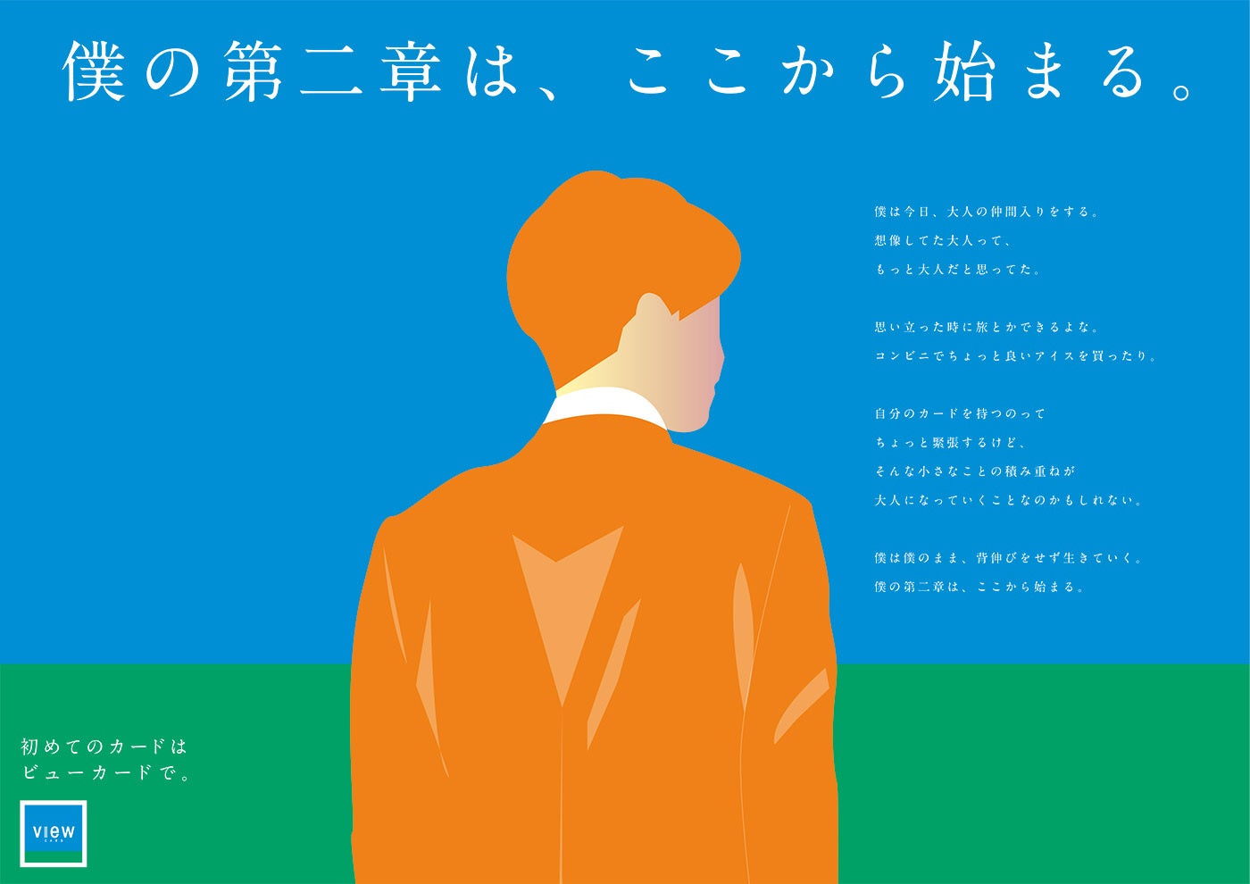 制作者コメント:「等身大の自分」をテーマに、新社会人の期待や不安に寄り添う広告を提案。広がる未来へ踏み出す後ろ姿と、「第二章は、ここから始まる。」の言葉で共感を呼びます。ビューカードが新たな一歩をそっと後押しする存在として伝わるようにしました。