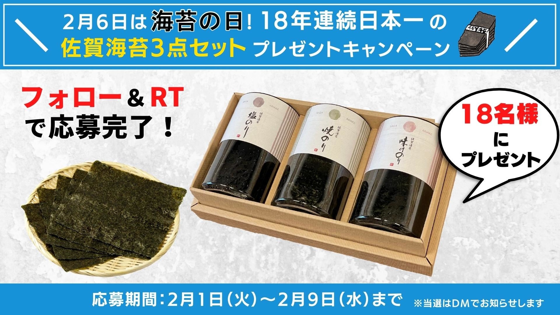 さが県産品流通デザイン公社は、2月6日(日曜日)の「海苔の日」を記念して、2022年2月1日(火曜日)~9日(水曜日)の9日間、公式Twitter「さがぴん」にて、18年連続で生産量・販売額ともに日本一の佐賀海苔のプレゼントキャンペーンを開催いたします。
