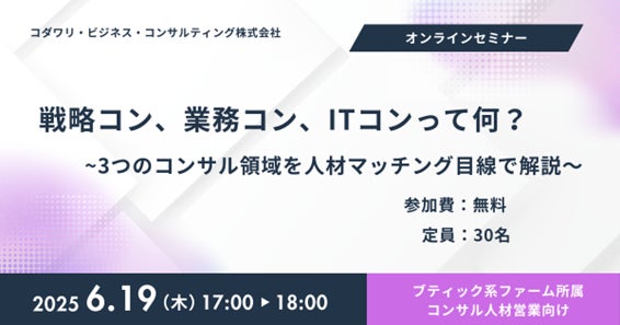 戦略やDXなどのテーマを手掛ける総合系コンサルティングファーム「コダワリ・ビジネス・コンサルティング株式会社」主催で、2025年6月19日(木)、「戦略/業務/ITコンって何?~3つのコンサル領域を人材マッチング目線で解説~」のオンラインセミナーをブティックコンサルファーム所属者限定で開催します。