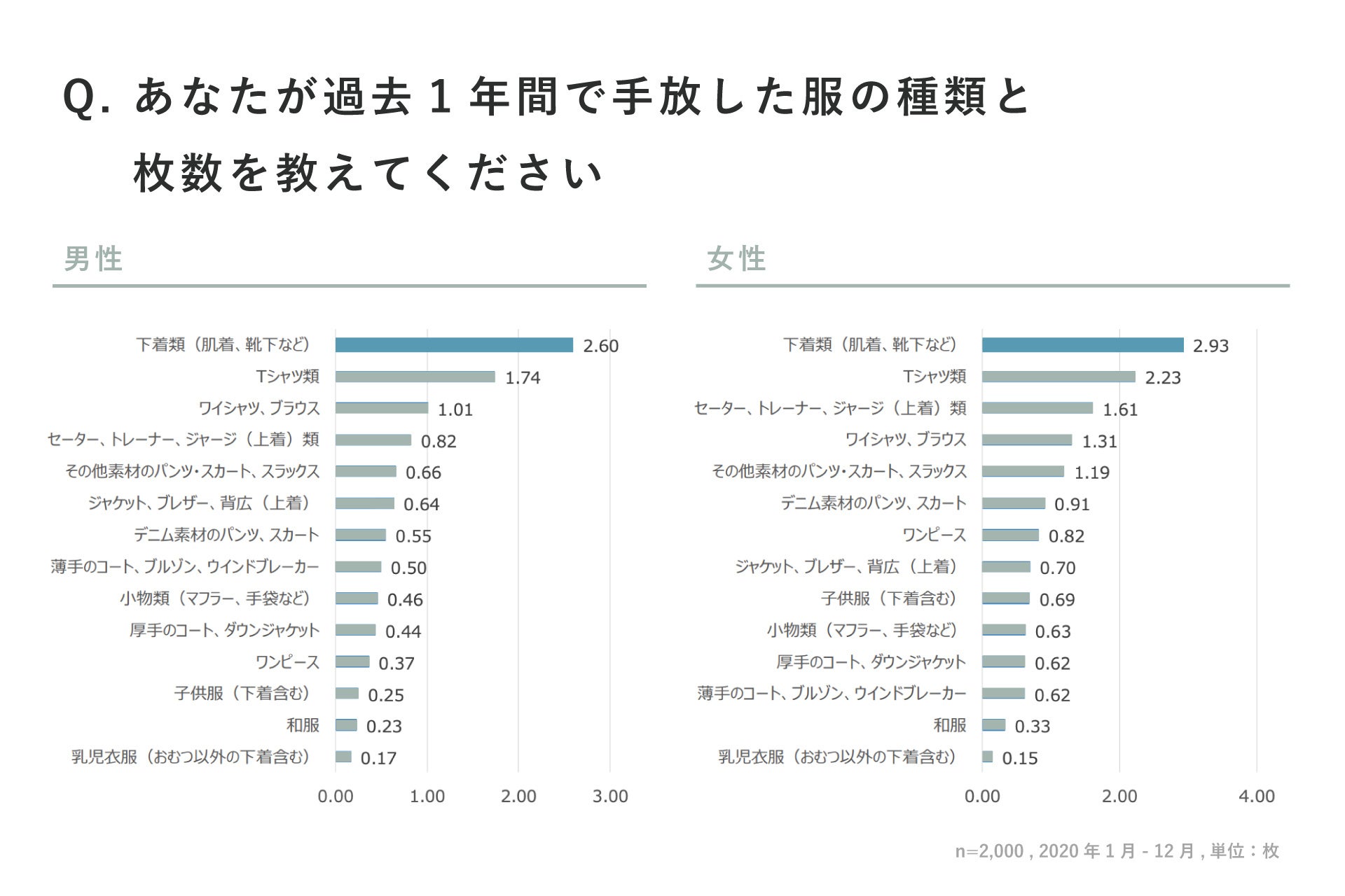 環境省の調べによると、衣類の中でも下着・靴下などのいわゆる消耗品は、1年間で最も購入頻度が高く(男性で4.02枚、女性で4.61枚)、かつ最も手放した数が多いカテゴリーに分類されています。(男性で2.6枚、女性で2.93枚)*1