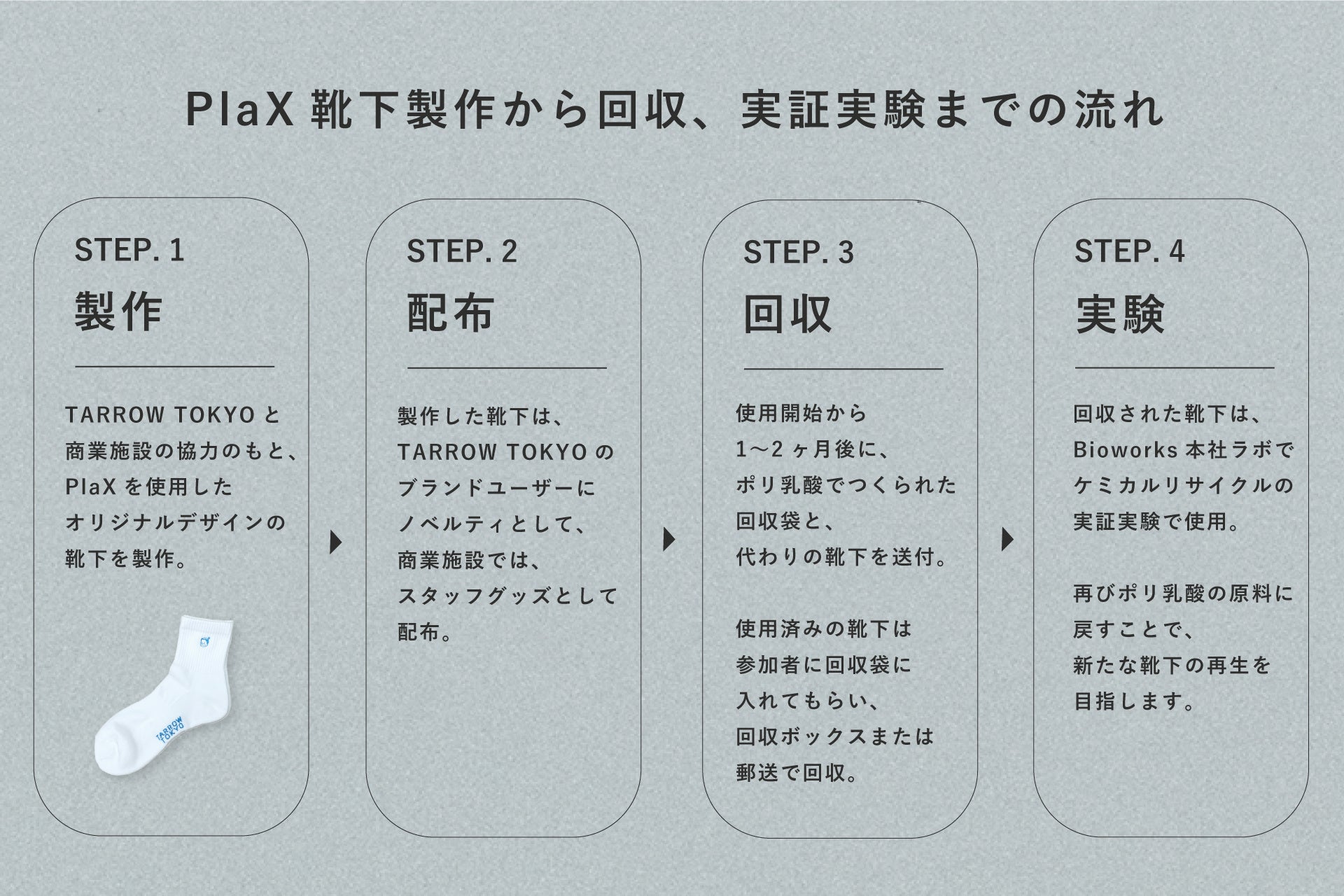 Bioworksは、株式会社グラックジャパン(本社:名古屋市中区、 取締役社長:由比康之)が運営する自社ブランド「TARROW TOKYO」と都内商業施設の2社協力のもと、PlaXのケミカルリサイクルの実証実験と、回収方法の最適化や、消費者の参加率向上のための施策・検証を行います。