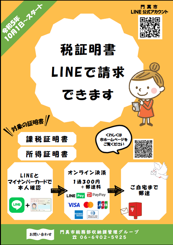 門真市では、2023年10月1日(日)から課税(非課税)証明書および所得証明書を門真市LINE公式アカウントからのオンライン請求の受付を開始しました。