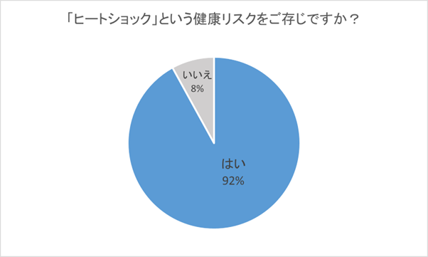 「ヒートショックという健康リスクをご存じですか?」と質問したところ、「はい(知っている)」の回答が全体の約9割を占め、「いいえ(知らない)」と回答した方は1割以下という結果でした。