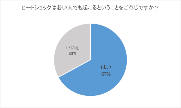 続けて、先ほど「はい(知っている)」と回答した方に、「ヒートショックは若い人でも起こるということをご存じですか?」と質問すると、「はい(知っている)」の回答は全体の7割に留まりました。