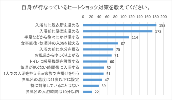 次に、自身が行なっているヒートショック対策をお聞きしたところ、「入浴前に脱衣所を暖める」「入浴前に浴室を暖める」が182票と圧倒的で、次に「手足などから徐々にかけ湯する」が172票、「食事直後・飲酒時の入浴を控える」が114票と続きます。