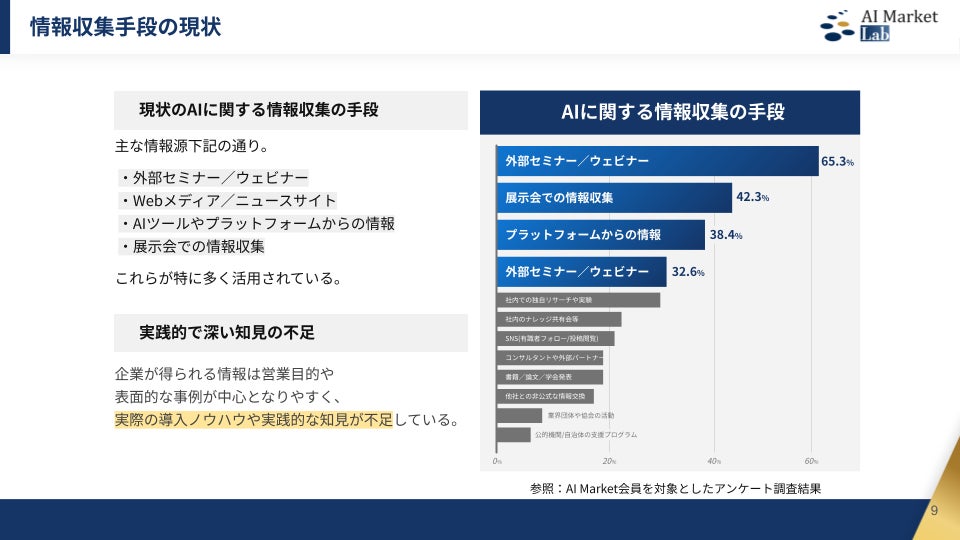 AI Marketが実施した調査によると、AIに関する情報収集手段として最も多く活用されているのは、外部セミナー・ウェビナー(65.3%)、展示会、プラットフォーム情報などが上位を占めています。