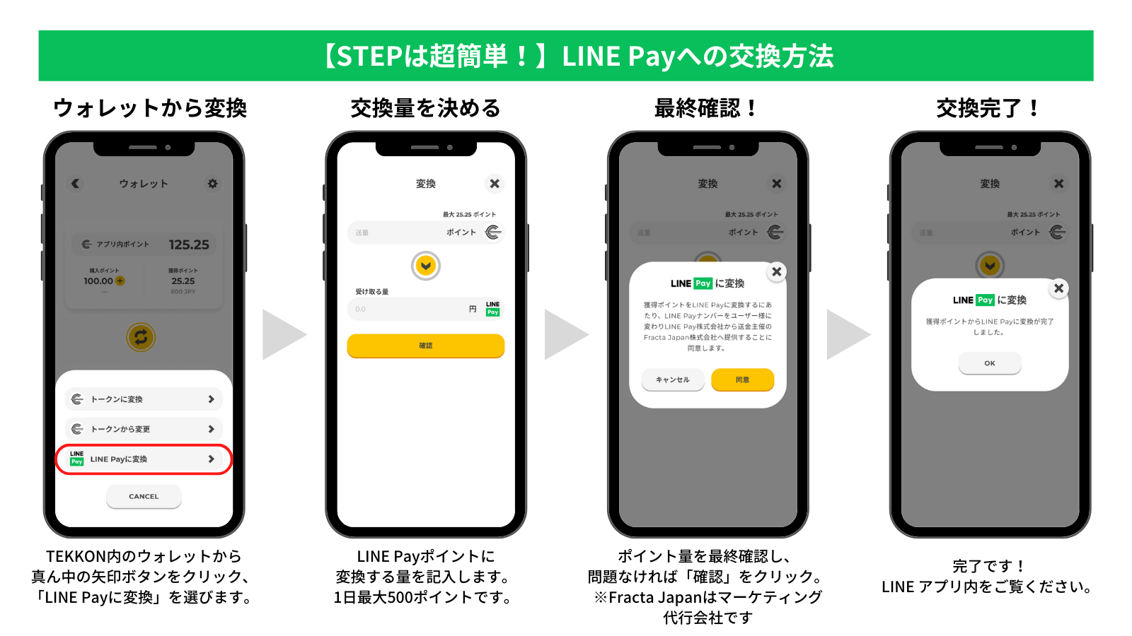 今回、獲得したポイントを1ポイント=1円でLINE Payに変換できるキャンペーンを期間限定で実施します。これまで獲得してきたポイントも、これから3月31日(金)までの期間で新たに獲得するポイントも全て変換可能です。「TEKKON」が決済サービスと連携しポイントを変換できるようになるのは、初の試みとなります。